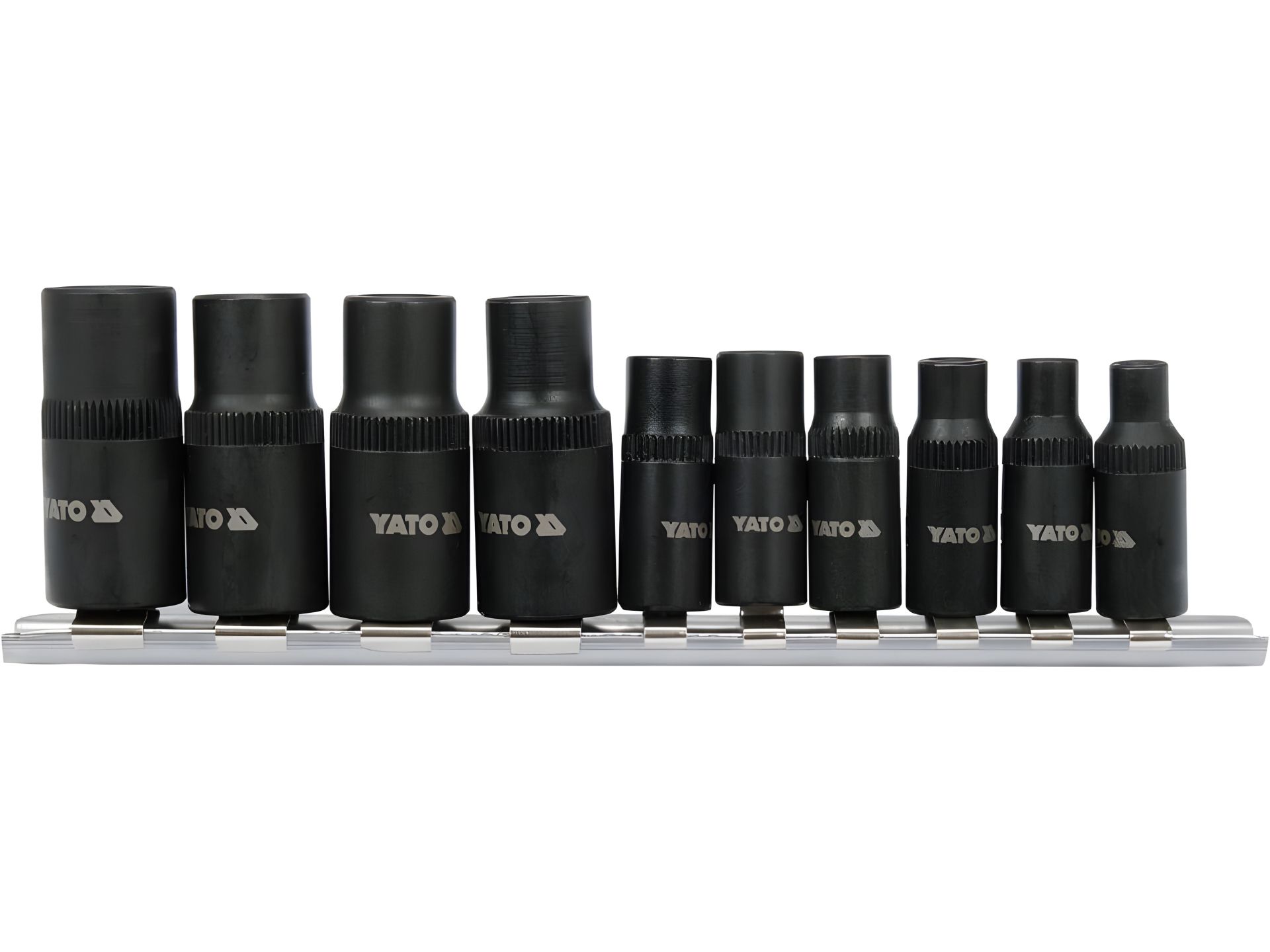 Набор из 10 резьбонарезных переходников на стальной рейке.