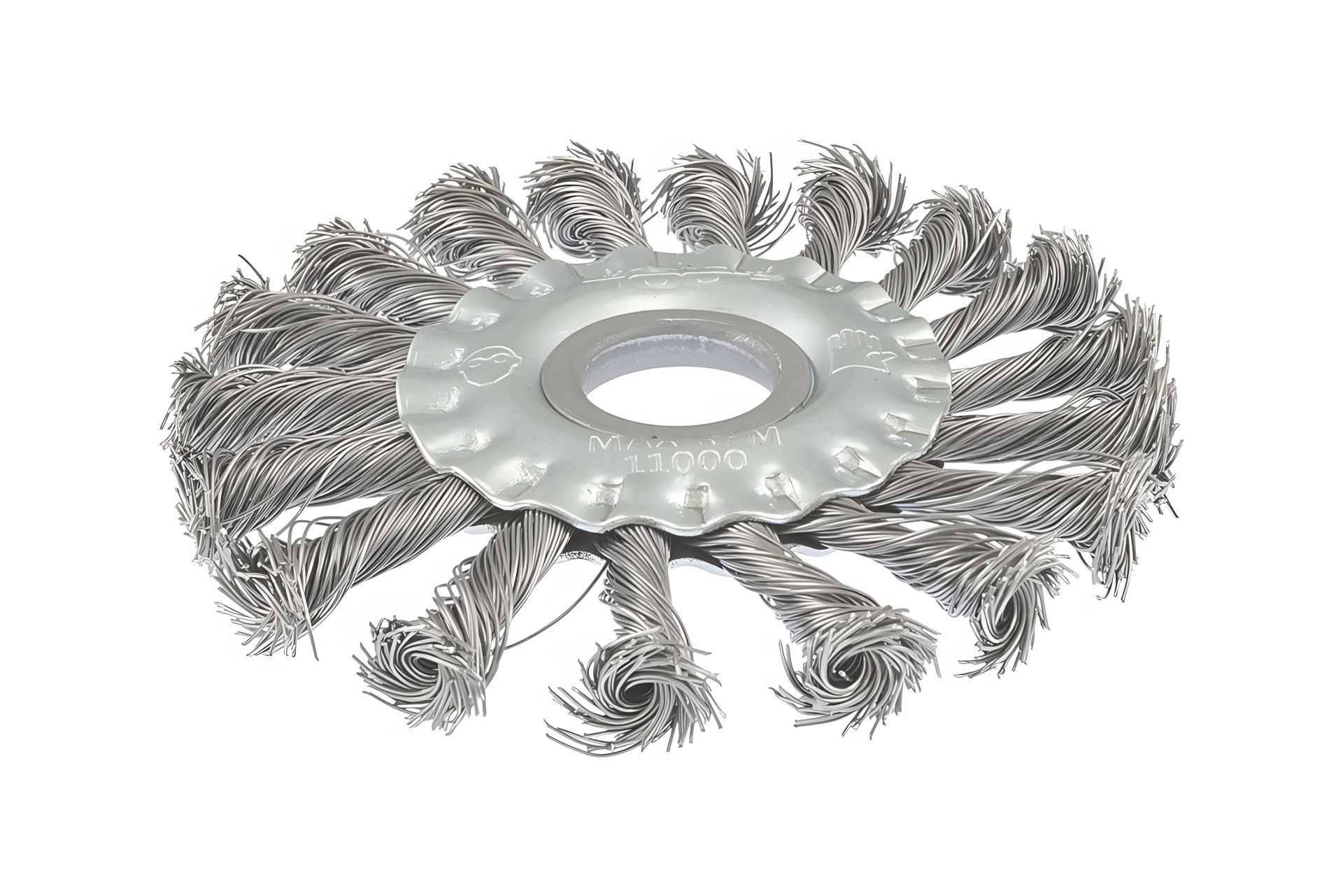 Щетка дисковая из плетеной проволоки Ø 115х22,2 мм предназначена для агрессивной очистки металлических поверхностей от ржавчины, окалины, краски и нагара. Изготовлена из высококачественной стальной проволоки, плотно скрученной в пучки, что обеспечивает высокую жесткость и долговечность. Крепление Ø 22,2 мм позволяет устанавливать щетку на стандартные угловые шлифовальные машины (болгарки).