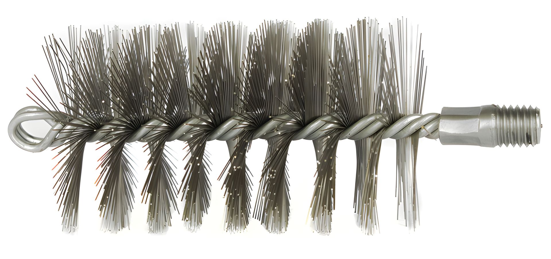 В конструкции ерша с одной стороны наружная резьба М12, предназначенная для подсоединения, например, дымоходного прута, с другой стороны петля для навешивания груза. Подобная щетка подходит для кирпичных дымоходов любого размера, длины и формы, также используется для чистки дымоходов из асбеста и черной стали.