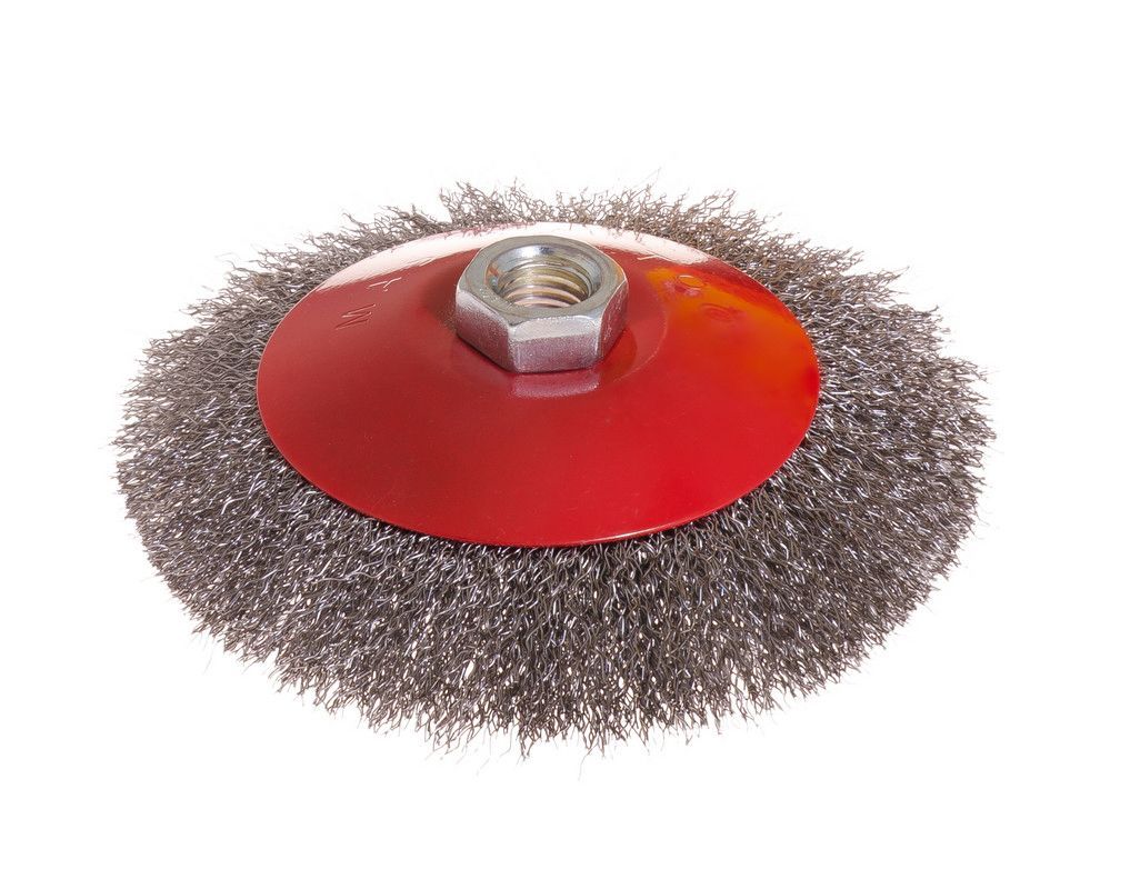 Щетка конусная из рифленой проволоки Ø 125 мм с резьбой М14. Предназначена для использования с угловыми шлифовальными машинами. Эффективно удаляет ржавчину, окалину, нагар, остатки краски и другие стойкие загрязнения с металлических поверхностей.