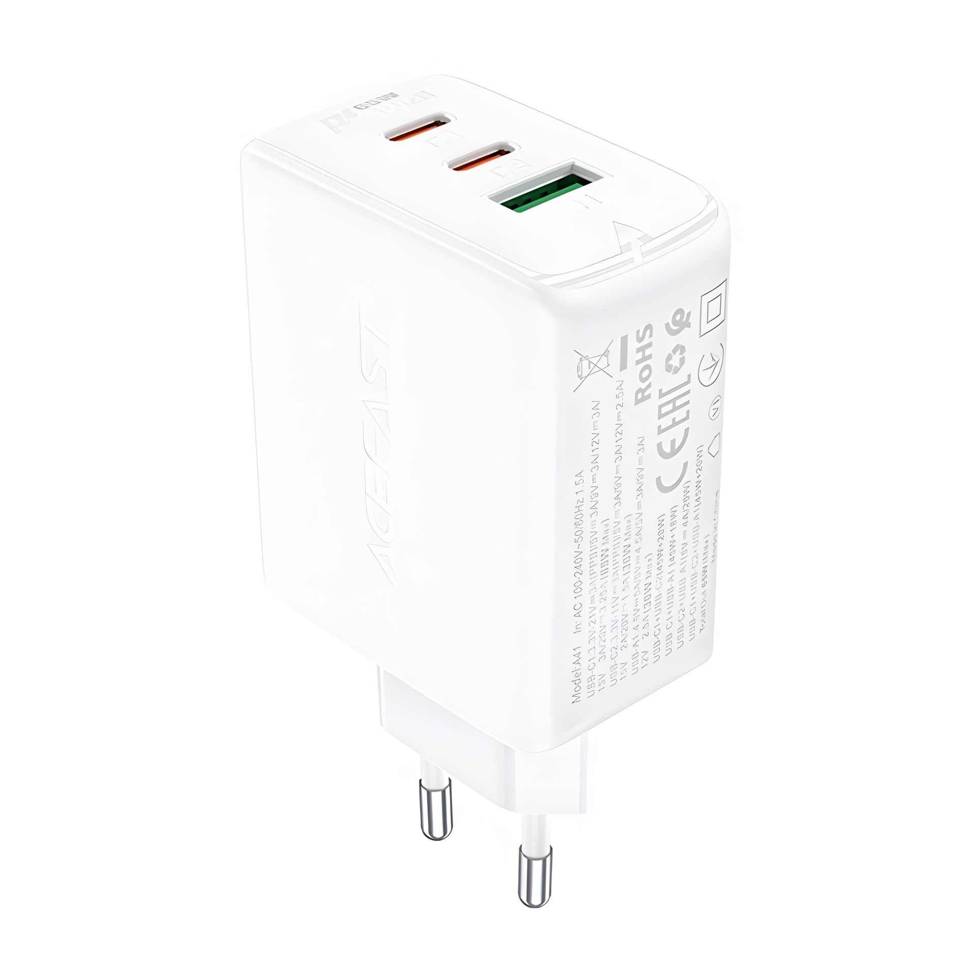 Белое зарядное устройство Acefast A41 USB/ 2 Type-C QC PD PD65W GaN