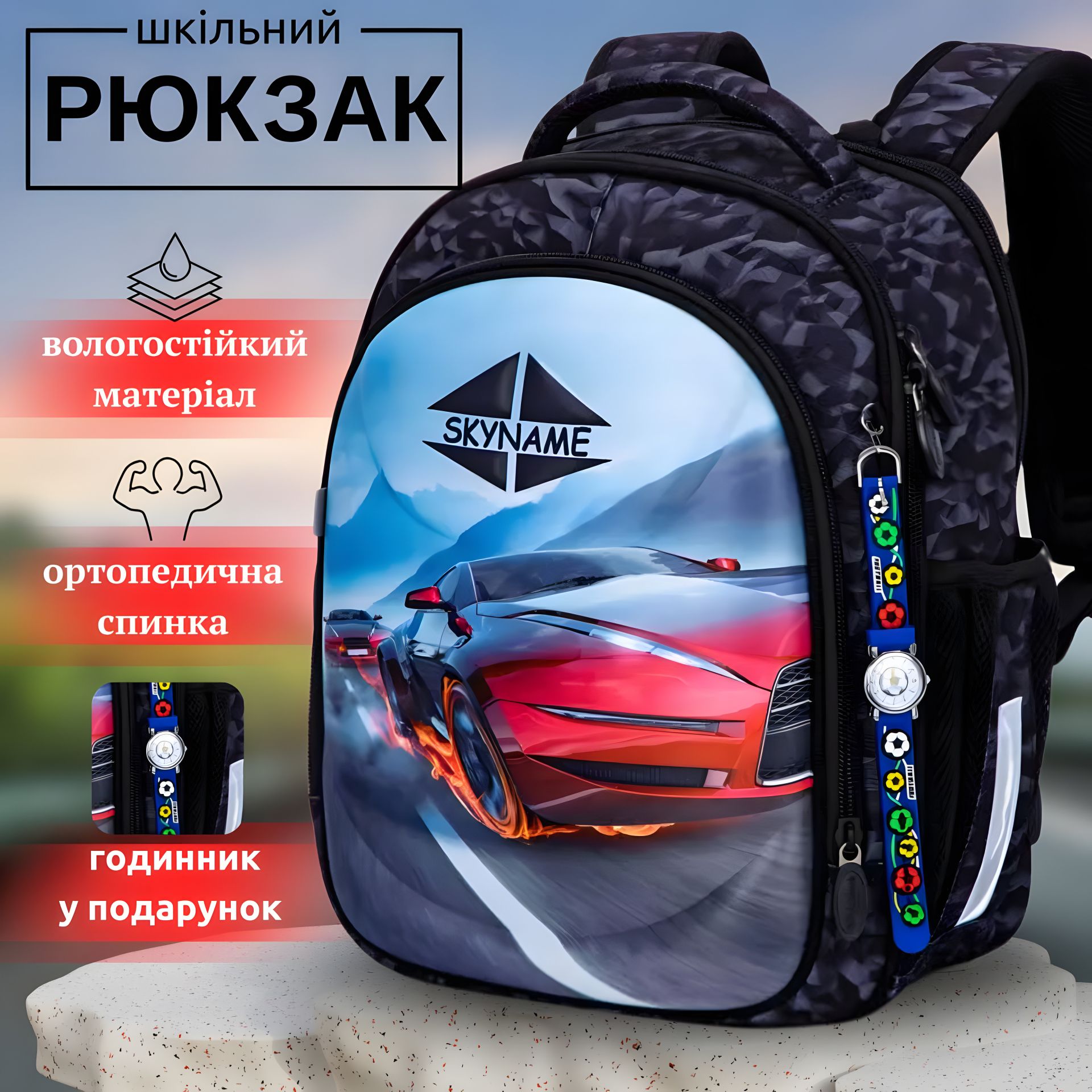 Школьный ранец для мальчика младших классов R4-417, жесткий каркас, два отдела, дополнительный карман, подарок-часы Winner One/SkyName размер: 29*16*35 см, чорно-серый