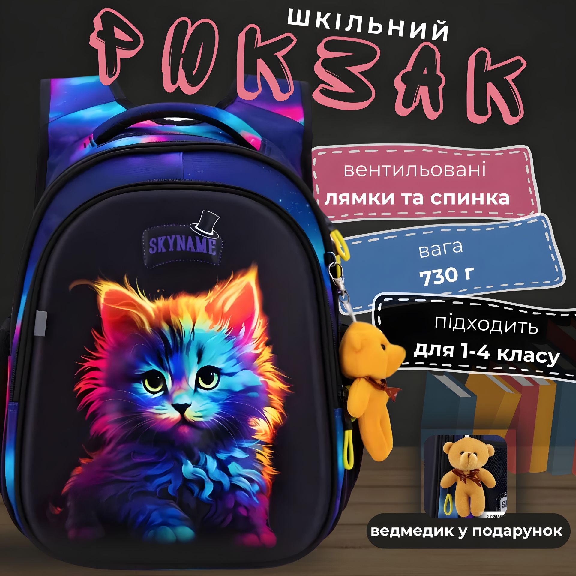 Школьный рюкзак Sky Name (Winner) для девочки 1-4 класс, принт Котенок, на 2 отделения В наличии