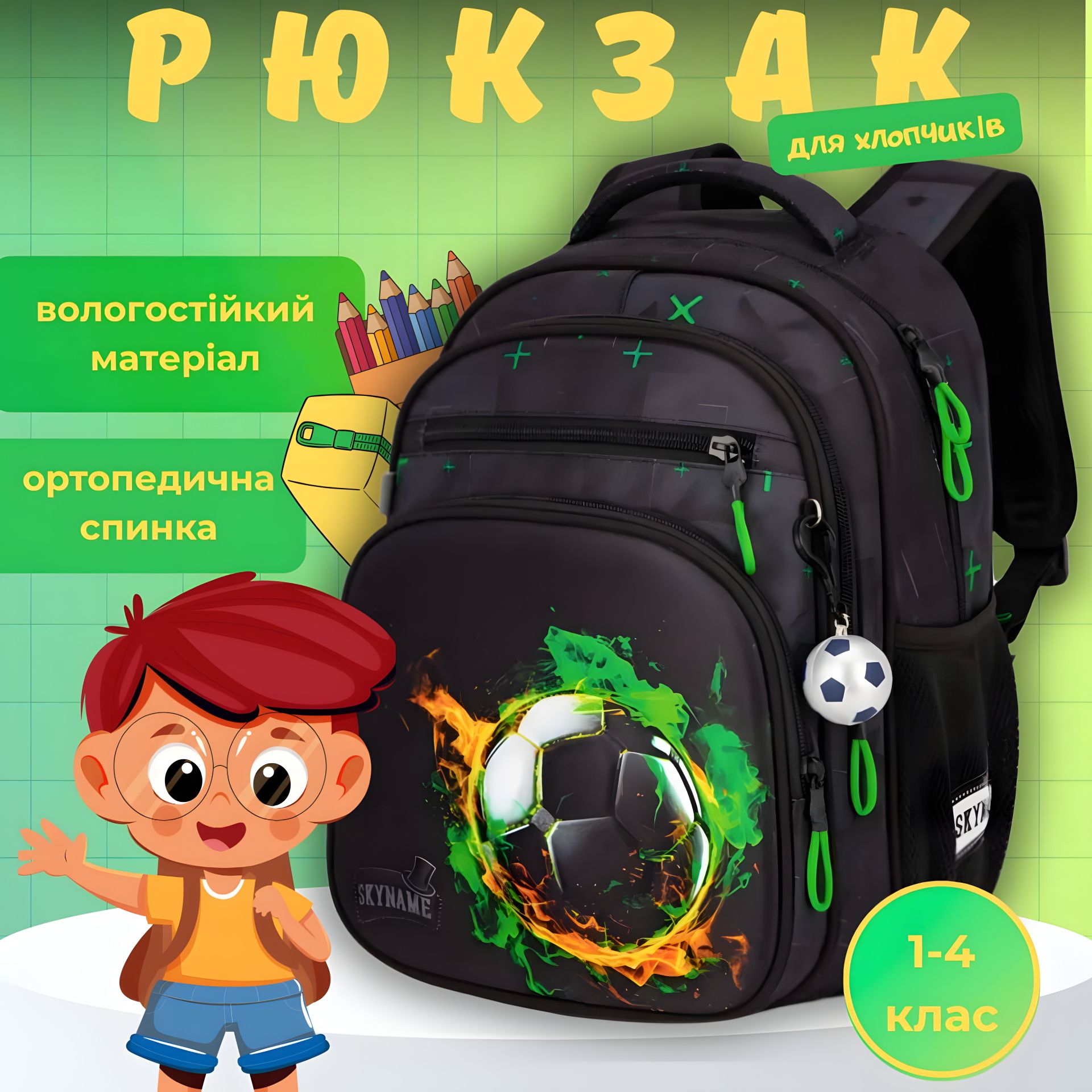 Этот рюкзак с ярким цветным мячом станет отличным выбором для мальчиков 1-4 классов, которые увлекаются спортом и хотят выделяться среди одноклассников. Черный цвет с зелеными акцентами создает стильный и энергичный вид, а практические функции рюкзака обеспечат комфорт в использовании в течение учебного дня.