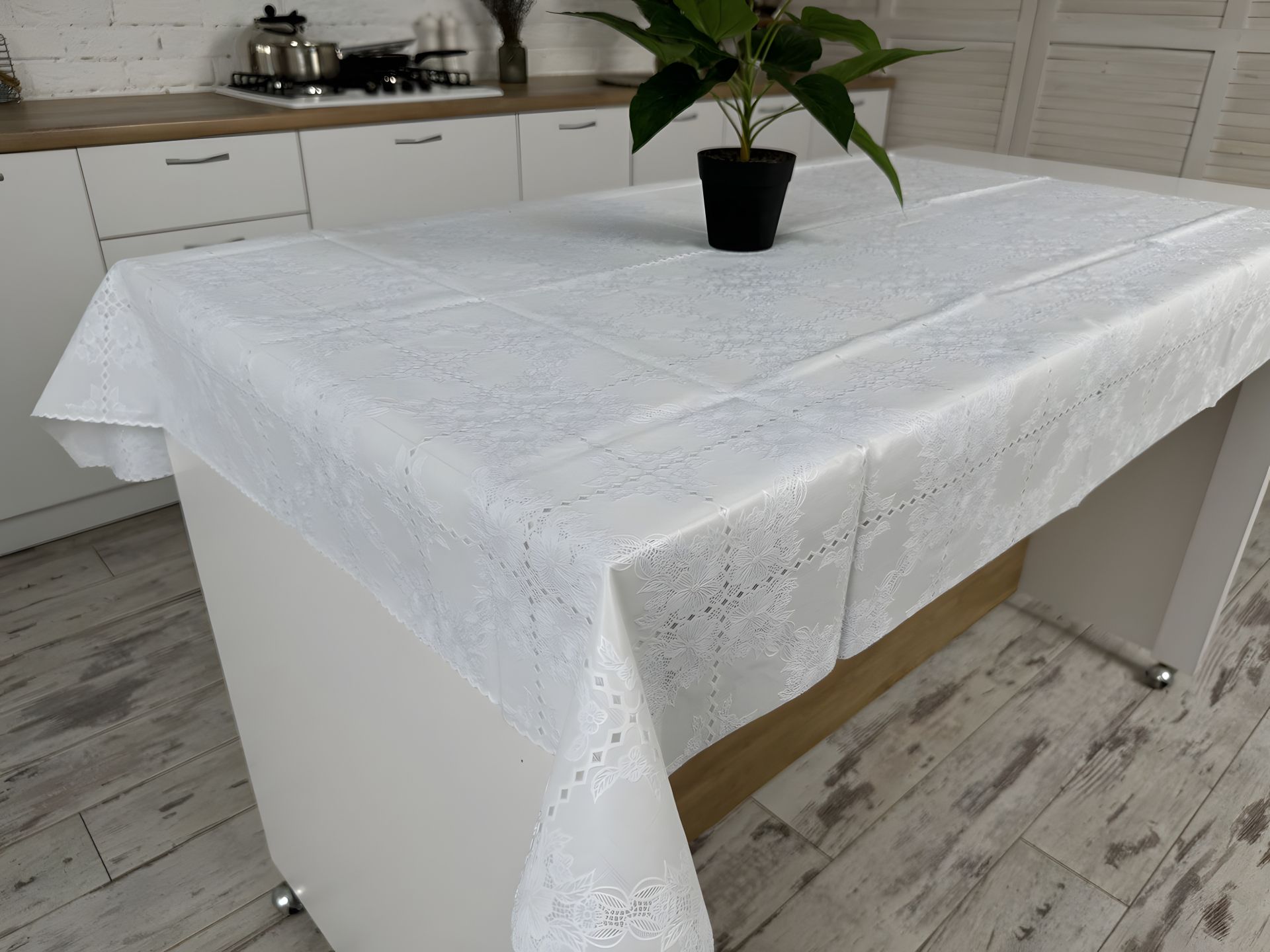 Скатертина з ажурним візерунком - відмінна прикраса кухні та практичність. Не вимагає прання – достатньо просто витирати вологою ганчіркою.Різноманітні візерунки дозволять кожному підібрати скатертину на власний смак. Матеріал – вініл, не пропускає воду, наскрізних отворів немає. Розмір 110*140 см.