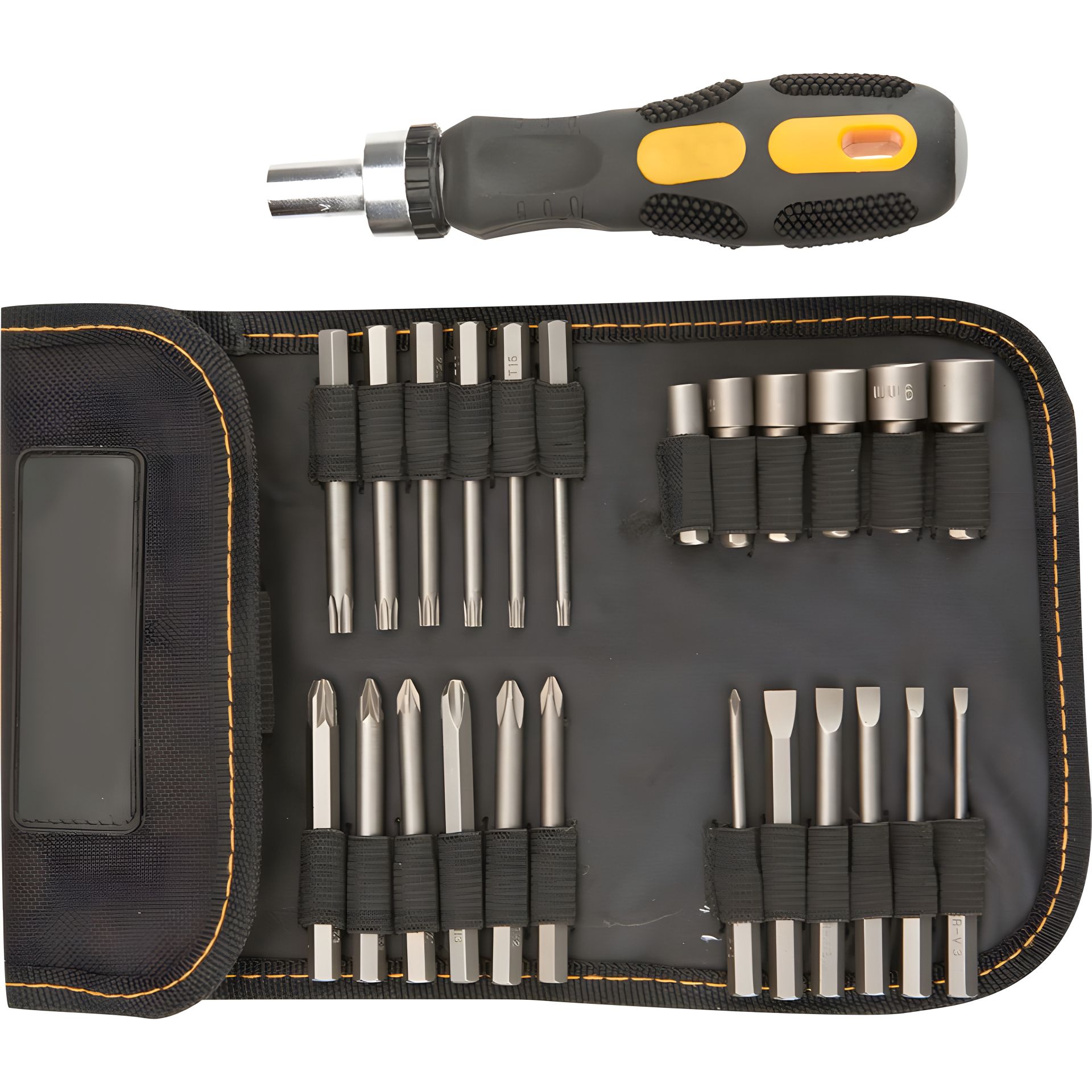 Набор сменных наконечников и головок TOPEX, состоит из 26 предметов, упакованных текстильный футляр. Весь инструмент изготовлен из высококачественной хромованадиевой стали, обеспечивающей долгий срок службы. В наборе сменные головки, наконечники, а также эргономичная пластмассовая рукоятка, покрытая антискользящим материалом, что обеспечивает комфорт работы. Набор предназначен для универсального применения, для мелких монтажных работ, ремонта оборудования и автомобилей, а также прочих работ в быту и в гараже каждого домашнего мастера. Бренд TOPEX предназначен для домашних мастеров.