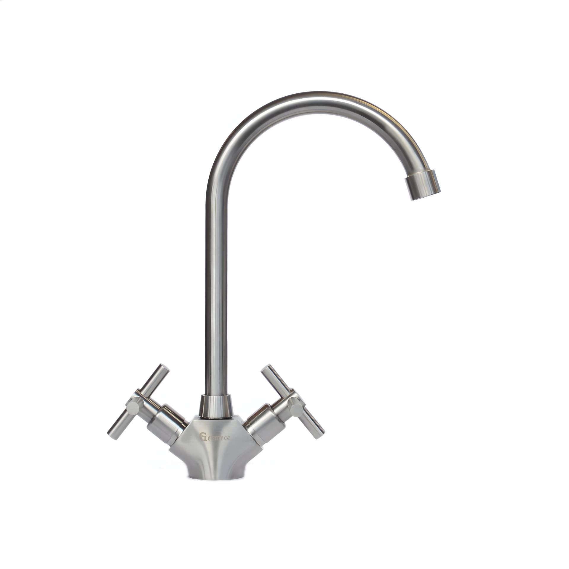 Кухонный двухвентильный смеситель Platinum 48 REY хорошо сочетается с современными дизайнами кухонных моек. Он имеет поворотное излияние, что облегчает мытье посуды и наполнение высокой посуды, мытье овощей и рук.