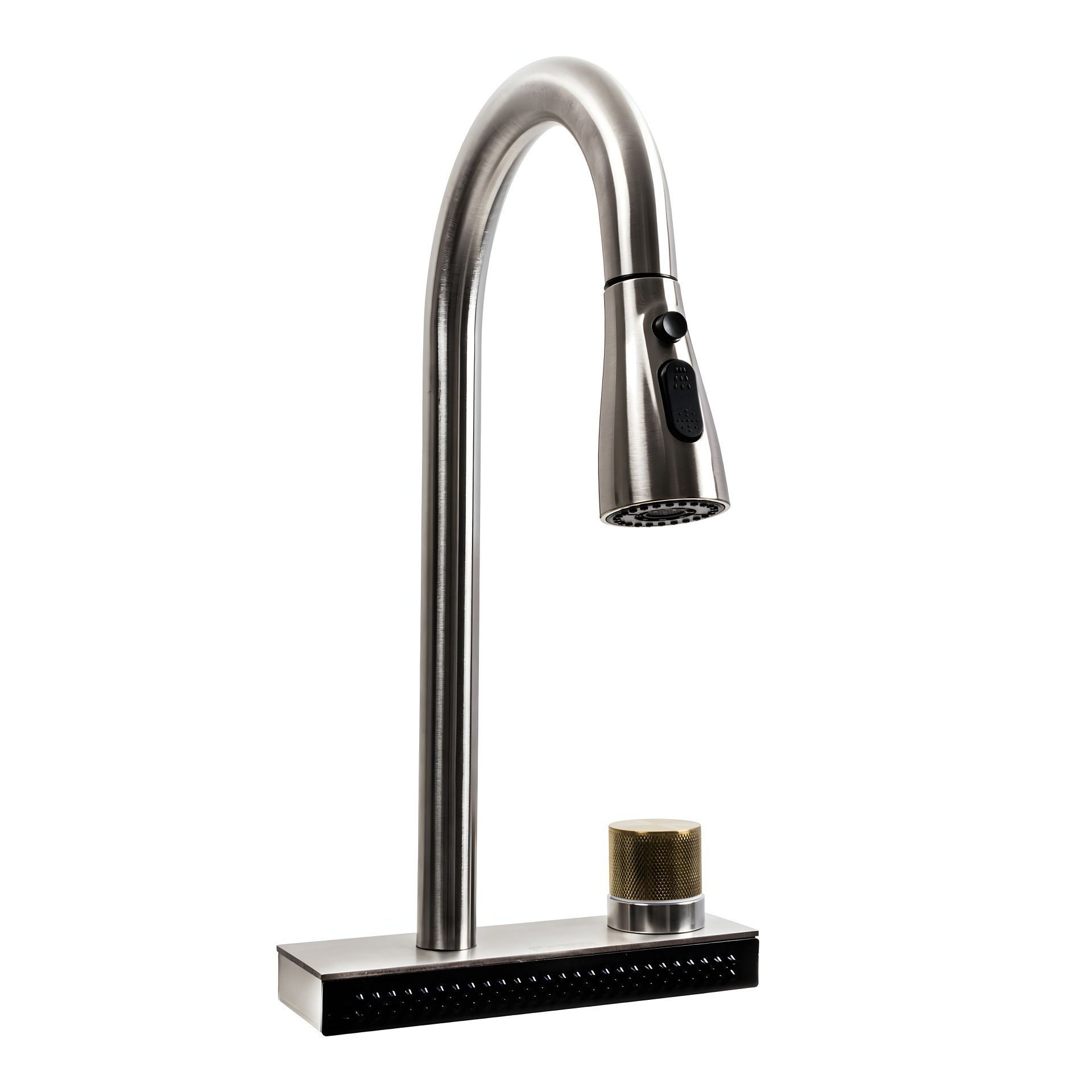 Переключатели режимов удобно расположены на аэраторе, что позволяет легко настраивать подачу воды под ваши нужды. Особенностью этого смесителя является функция "Водопад", которая добавляет роскошь и обеспечивает эффективную мойку от основания корпуса.