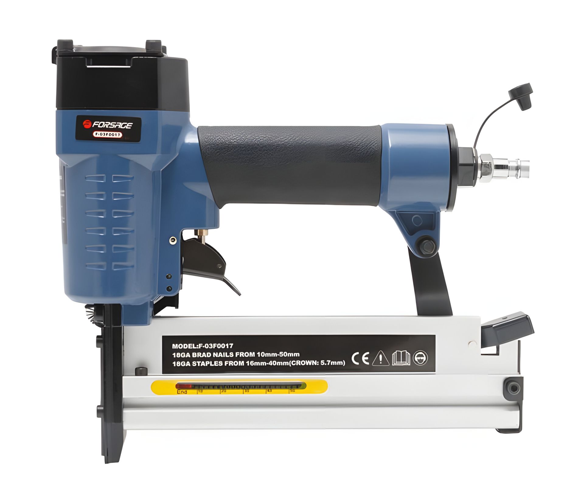 Пневматический степлер 2 в 1 Forsage F-03F0017 предназначен для скрепления материалов между собой. Он рассчитан на работу со скобами и штифтами размером 10-50 мм. Корпус инструмента выполнен из алюминиевого сплава и имеет обрезиненную рукоять для удобного захвата. Рабочее давление составляет 4-7 атм.