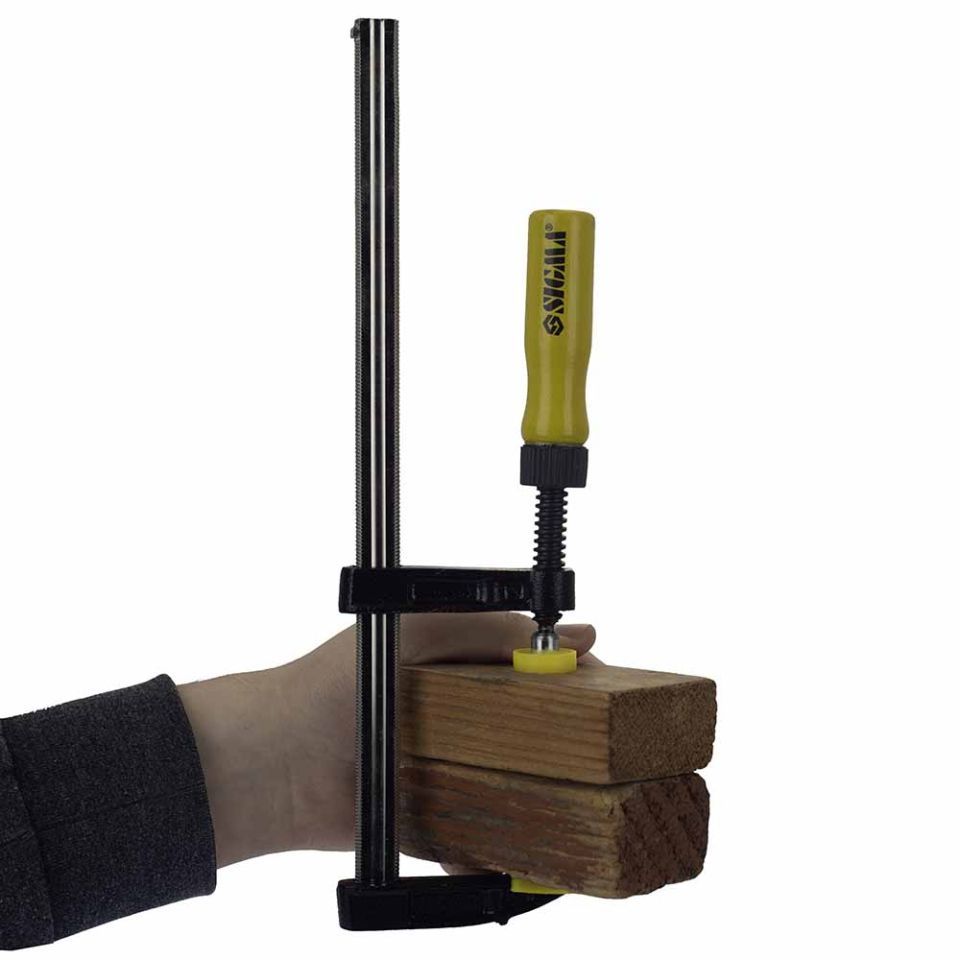 Ручка приспособления изготовлена из окрашенного дерева и покрыта защитным лаком. Струбцина такой формы гарантирует максимально надежный зажим, защищенный от срыва.