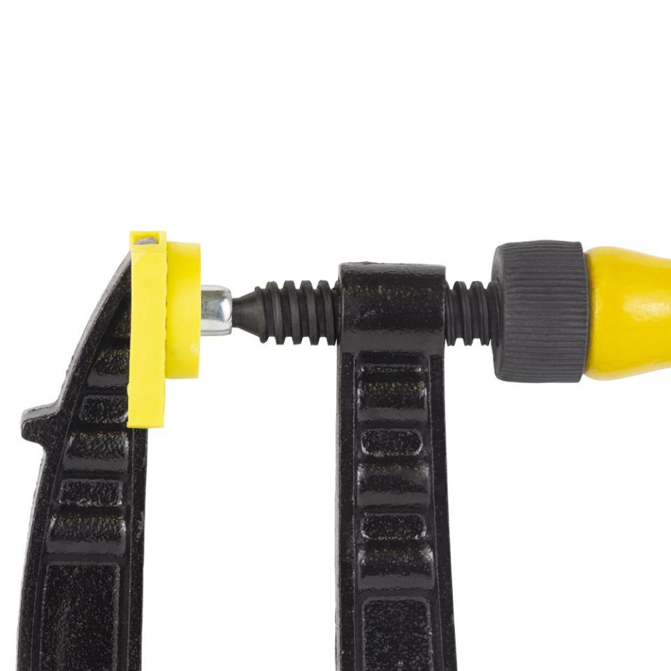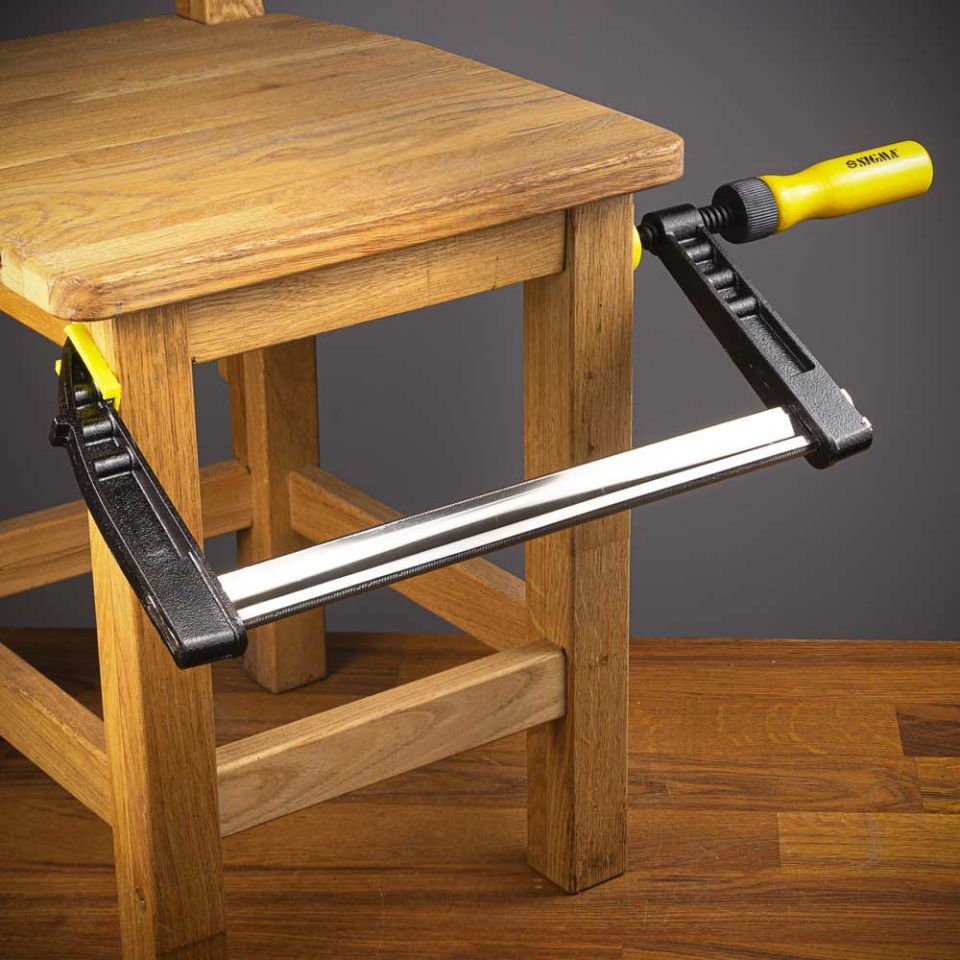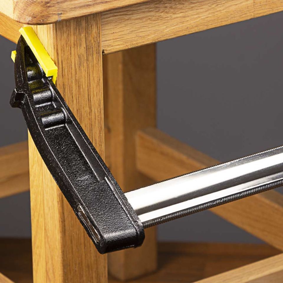 Материал конструкции инструментальная сталь, отличающаяся своей высокой прочностью, что обеспечивает долгий срок службы приспособления и надежную фиксацию. Шпиндель с трапециевидной резьбой обеспечивает передачу усилий на заготовку и при этом имеет легкий ход. Ручка приспособления изготовлена из окрашенного дерева и покрыта защитным лаком.Струбцина такой формы гарантирует максимально надежный зажим, защищенный от срыва.