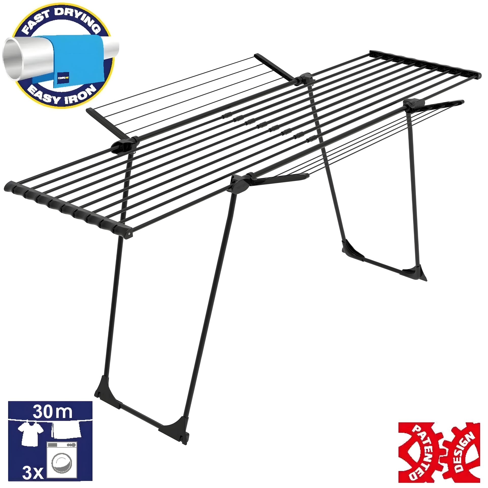 Стержни имеют увеличенный диаметр, они зажаты в боковые панели, благодаря чему сушилку трудно случайно повредить. Запатентованная конструкция раздвижения двух частей увеличивает удобство использования сушилки. Боковые крылья складываются и разлагаются, обеспечивая дополнительное место для сушки вещей. Колесики в основе ножек облегчают передвижение загруженной сушилки и сохранят поверхность пола от повреждения. Две специальные пластиковые панели по бокам предназначены для сушения носков и других мелких вещей.