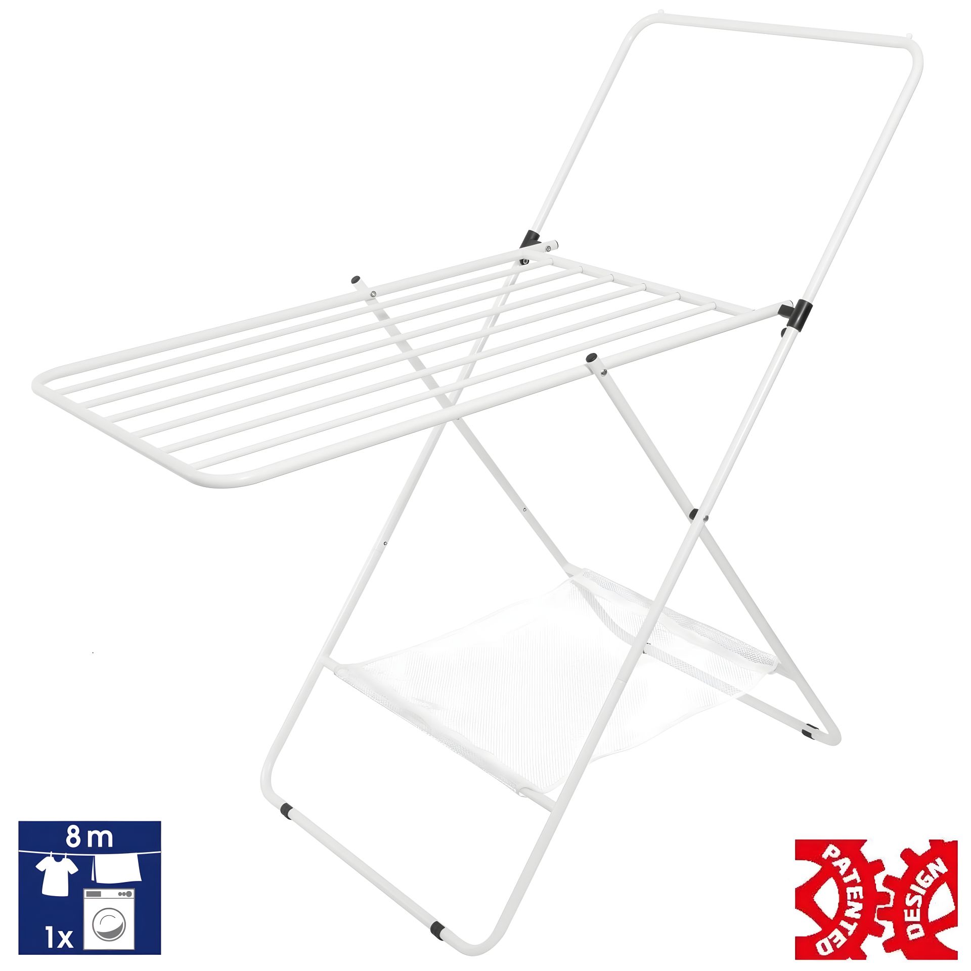Утолщенные стержни практически не оставляют полос на белье и ускоряют процесс сушки. А запатентованная конструкция позволяет разложить сушилку одной рукой и делает невозможным падение сушилки во время использования. В сложенном виде без нижней полочки сушилка имеет всего 2 см толщины, что позволит разместить ее в малейшей нише. Пластиковые ножки уберегут поверхность пола от повреждения.