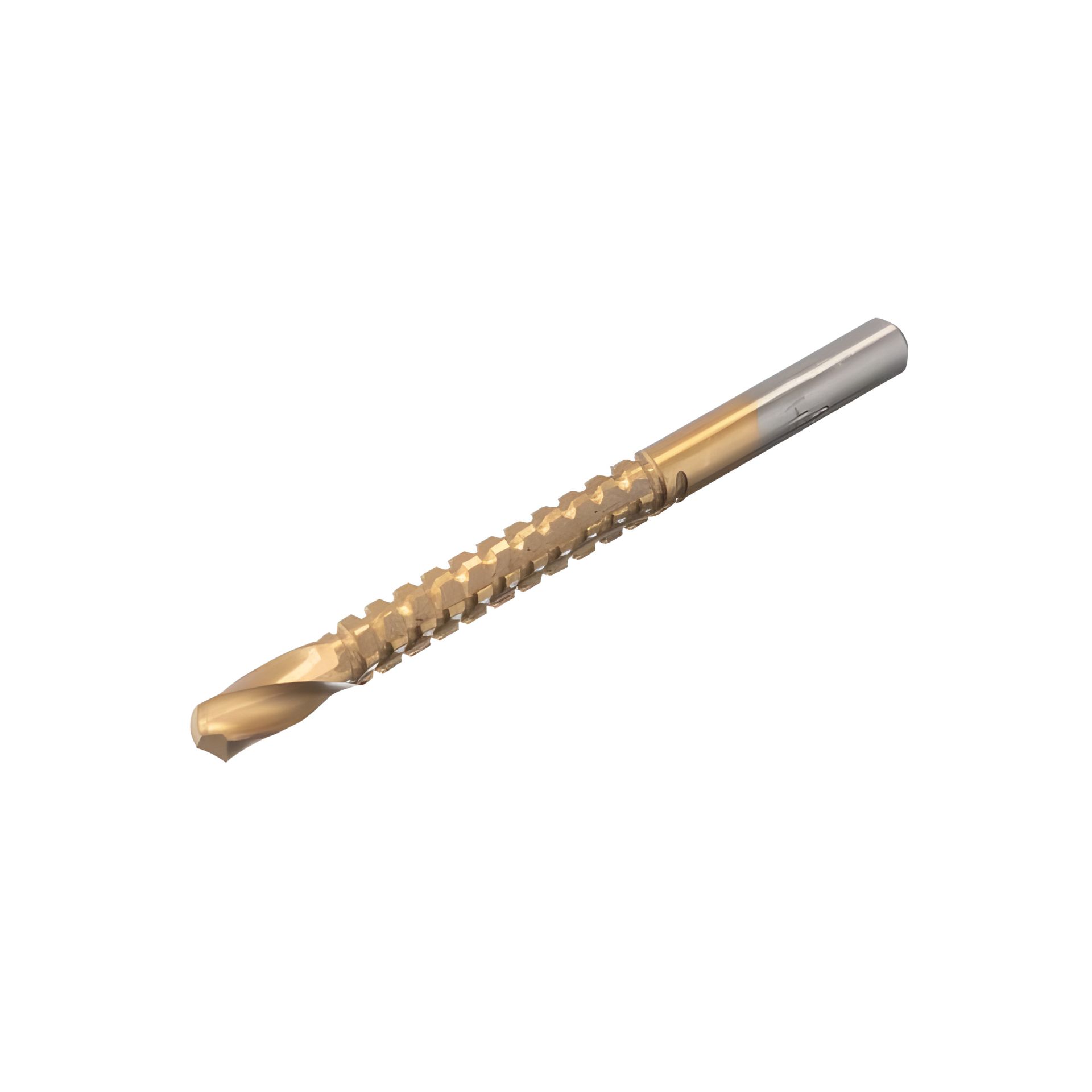 Поверхность рабочей зоны покрыта нитридом титана, что повышает износостойкость режущих кромок и защищает сверло от механических повреждений.