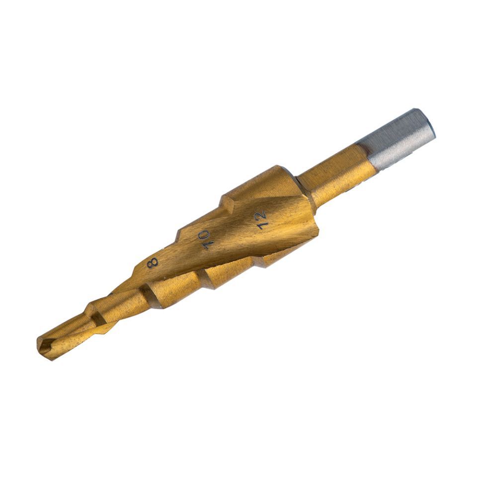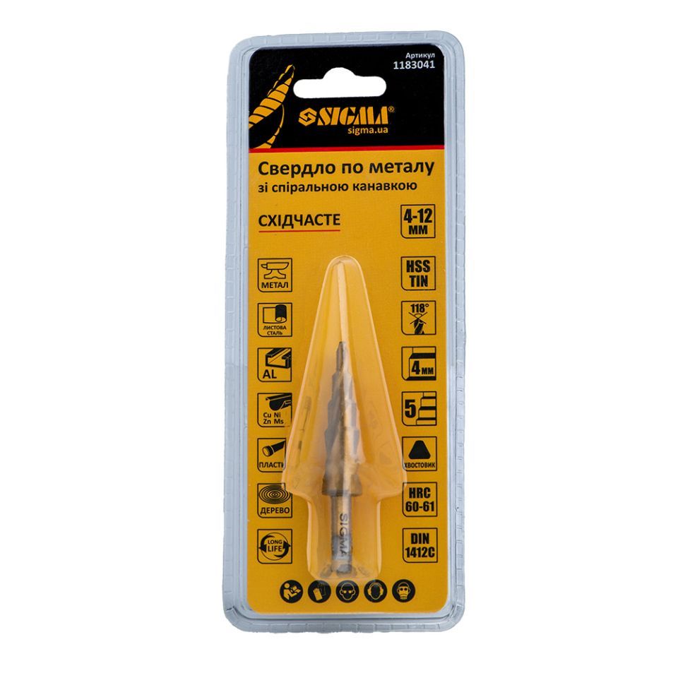 Сверло по металлу ступенчатое HSS-TIN титановое со спиральной канавкой Ø4-12мм, шаг 2мм (блистер) SIGMA (1183041) предназначенное для поэтапного получения отверстий разного диаметра без перестановки режущего инструмента в листовых, тонкостенных металлических и пластиковых конструкциях и заготовках толщиной до 4 мм. При работе рекомендуется использование смазочно-охлаждающих жидкостей.