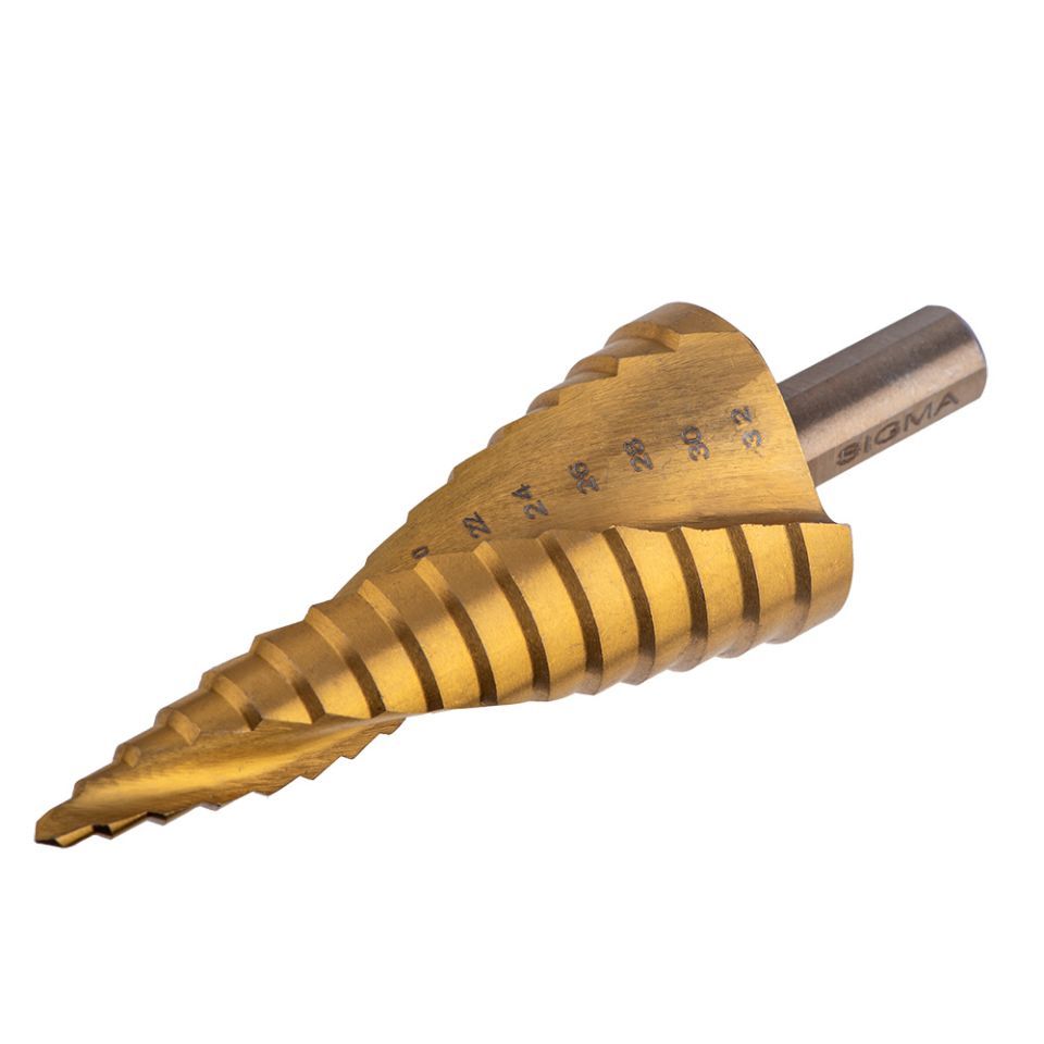 Сверло по металлу ступенчатое HSS-TIN титановое со спиральной канавкой Ø4-32мм, шаг 2мм (блистер) SIGMA 1183081