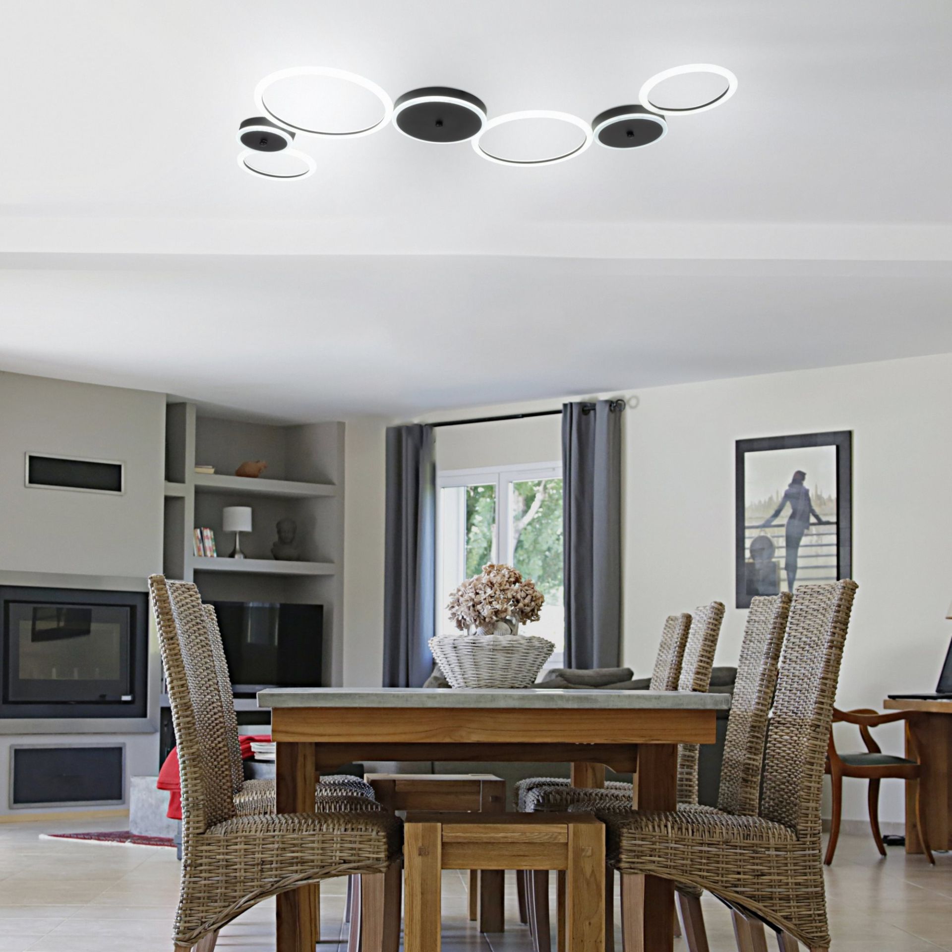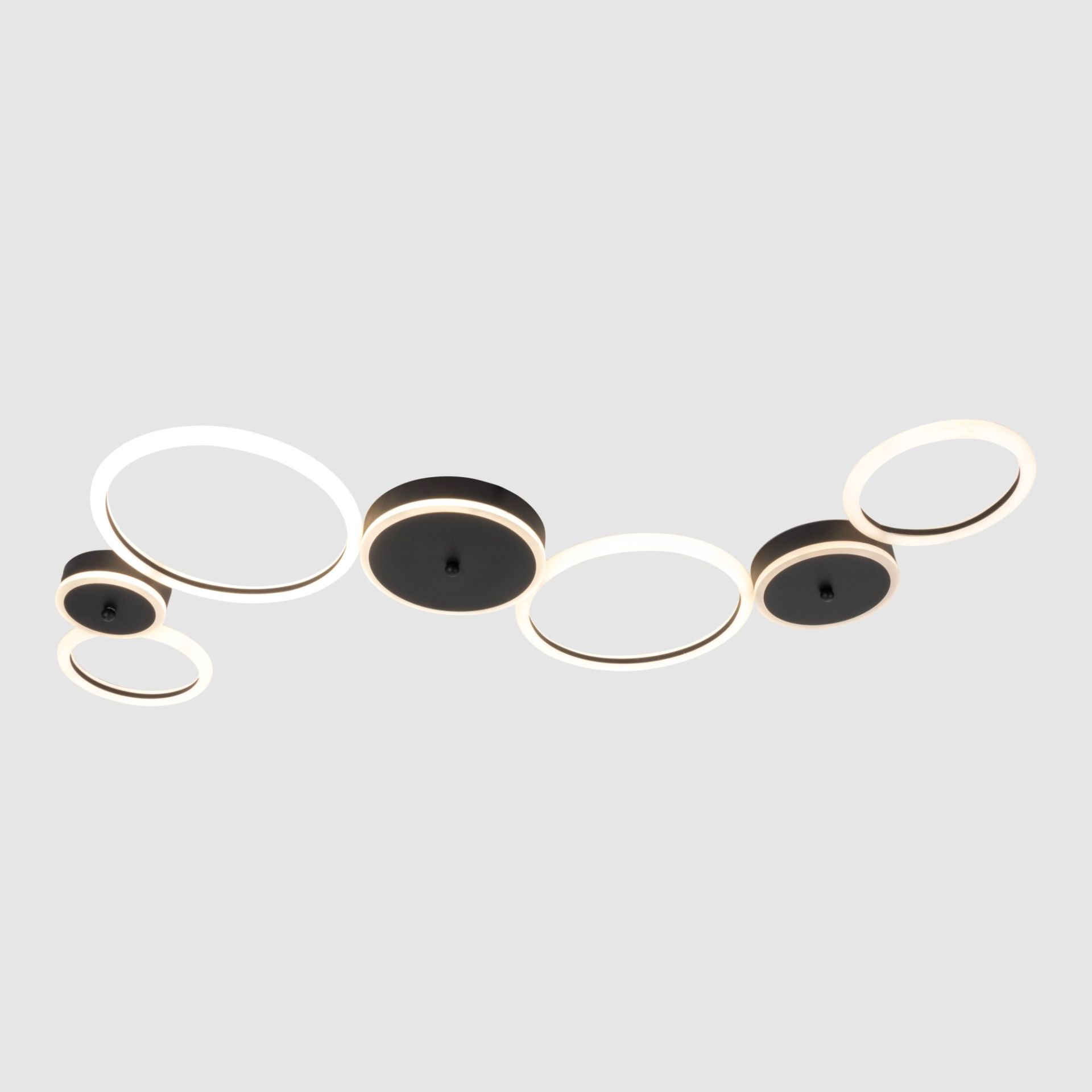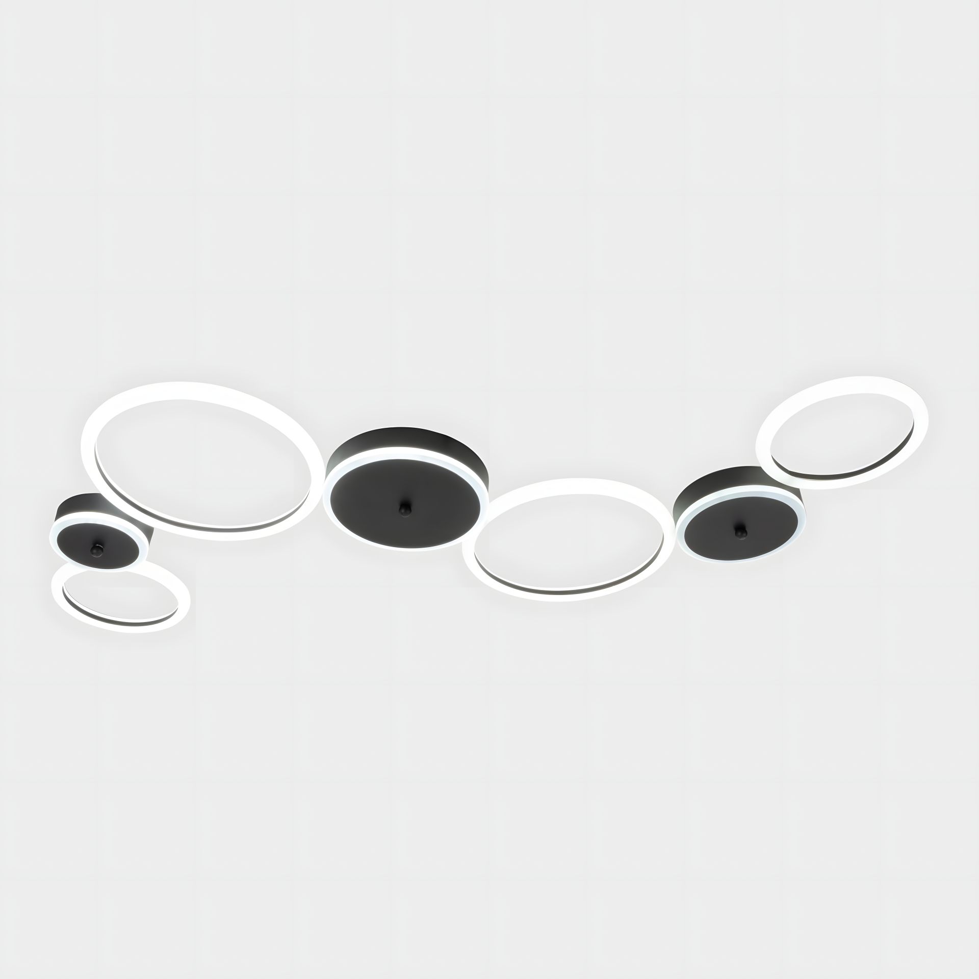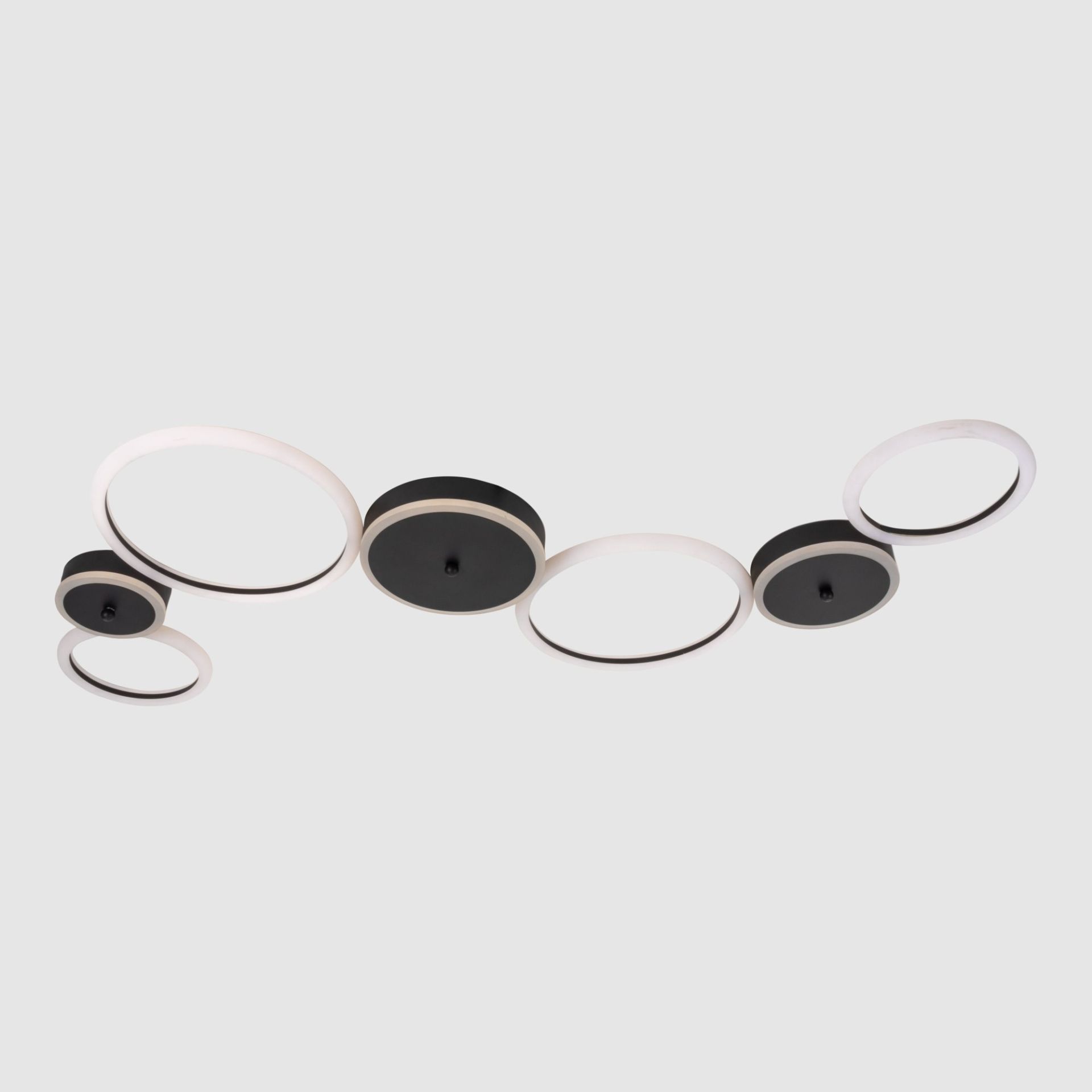 Дизайн светильника включает в себя кольца черного и белого цветов. Эта цветовая комбинация может создать интересный и современный вид, придавая особый акцент вашему пространству.