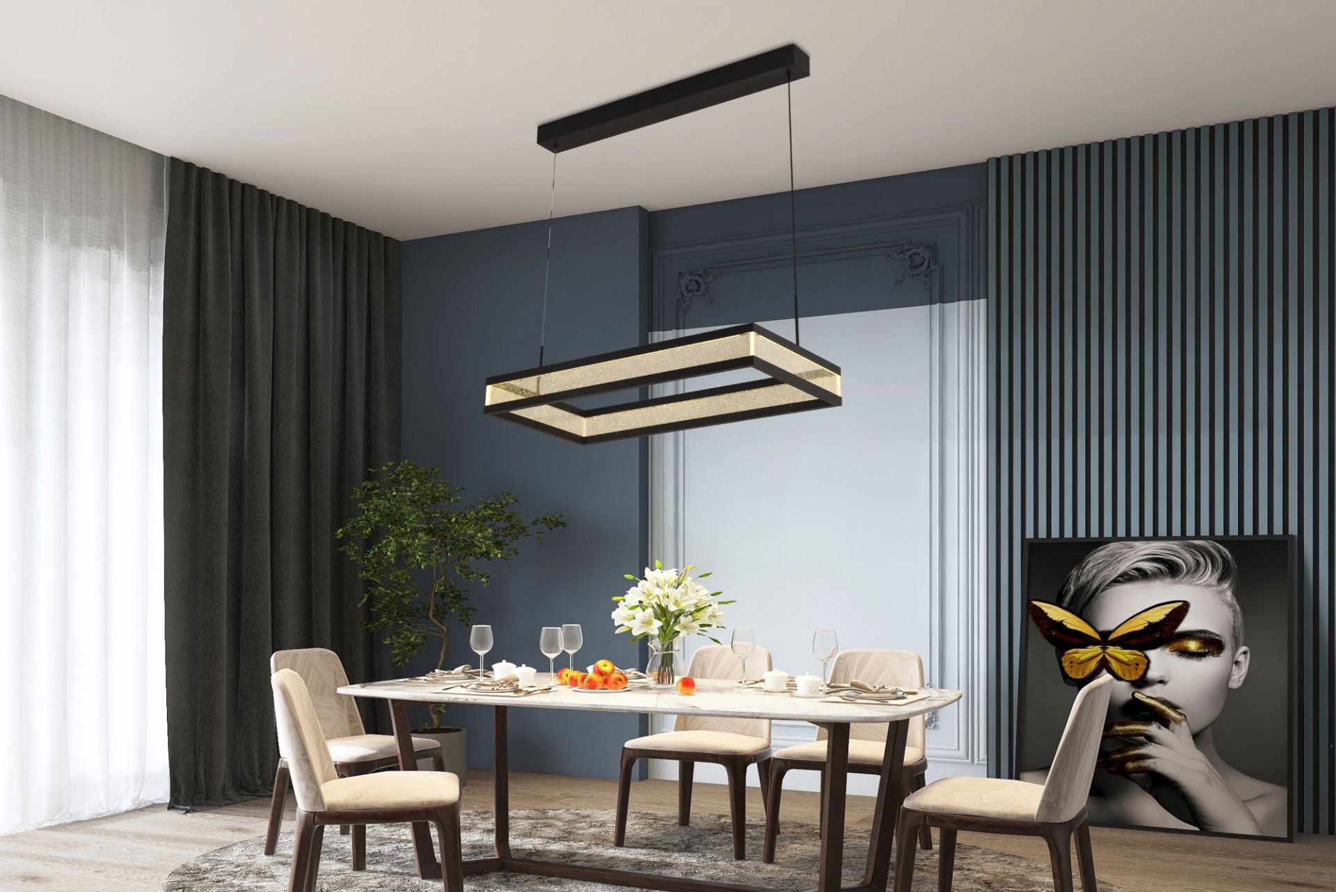 Корпус выполнен в черном цвете (BK), что придает элегантности и универсальности, позволяя гармонично сочетать люстру с интерьерами в стиле хай-тек, минимализм или модерн. Благодаря регулируемой высоте подвеса модель адаптируется под помещение с разной высотой потолков.
