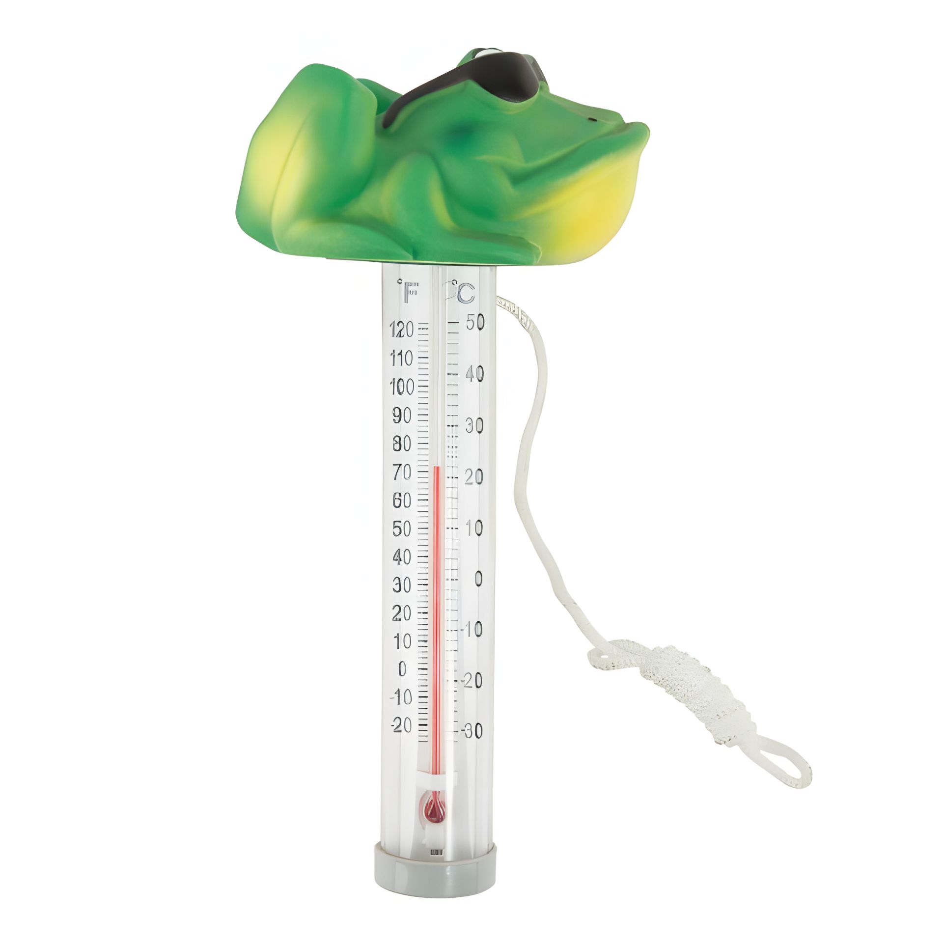 Плавающий термометр K725DIS/6P Жаба для бассейнов. Изготовлен из безвредного полимера, не содержит стекла, ртути или острых частей. Имеет две шкалы - Цельсия и Фаренгейта. Оснащен плавающим шнурком для крепления к стенке бассейна.