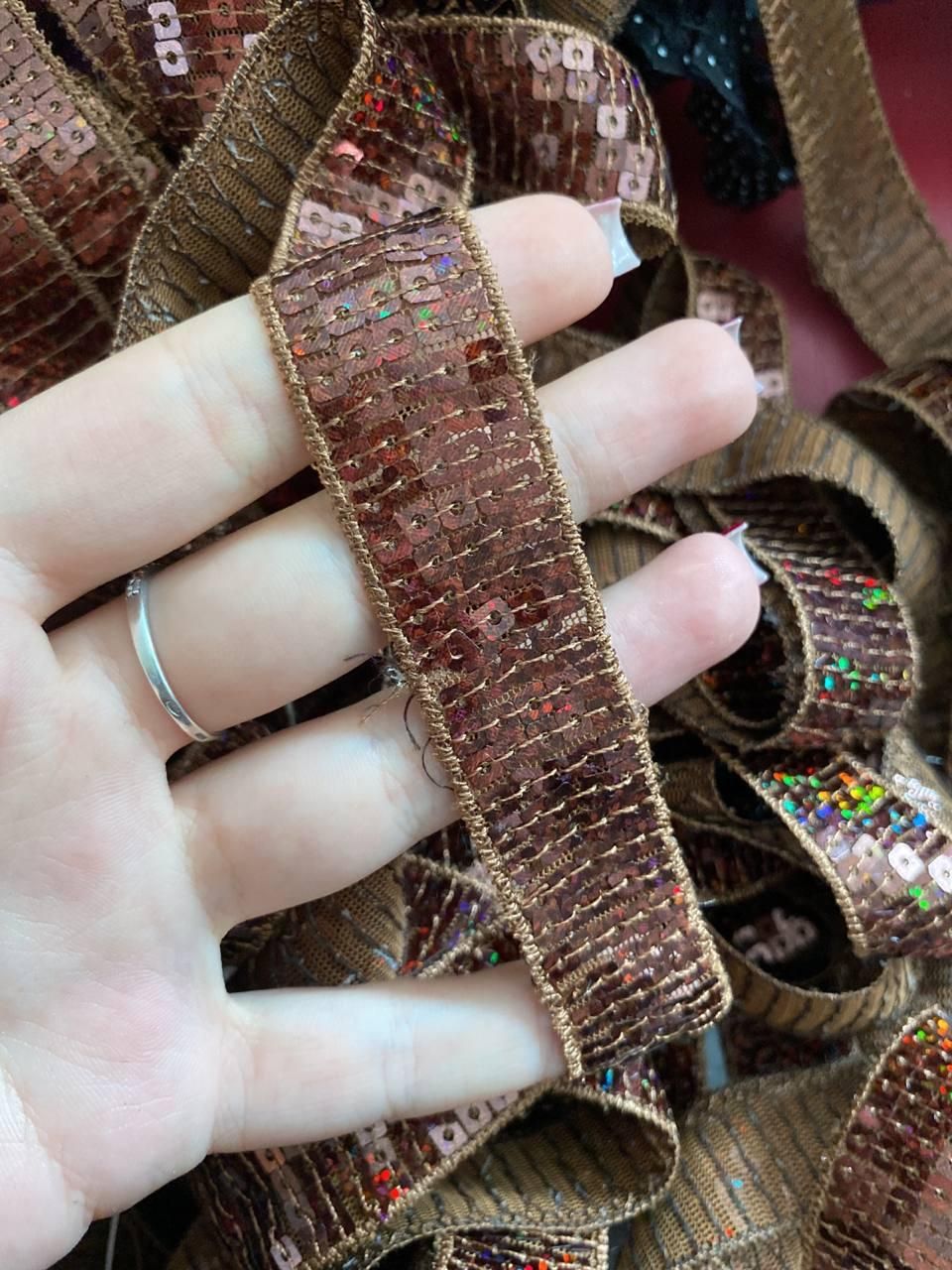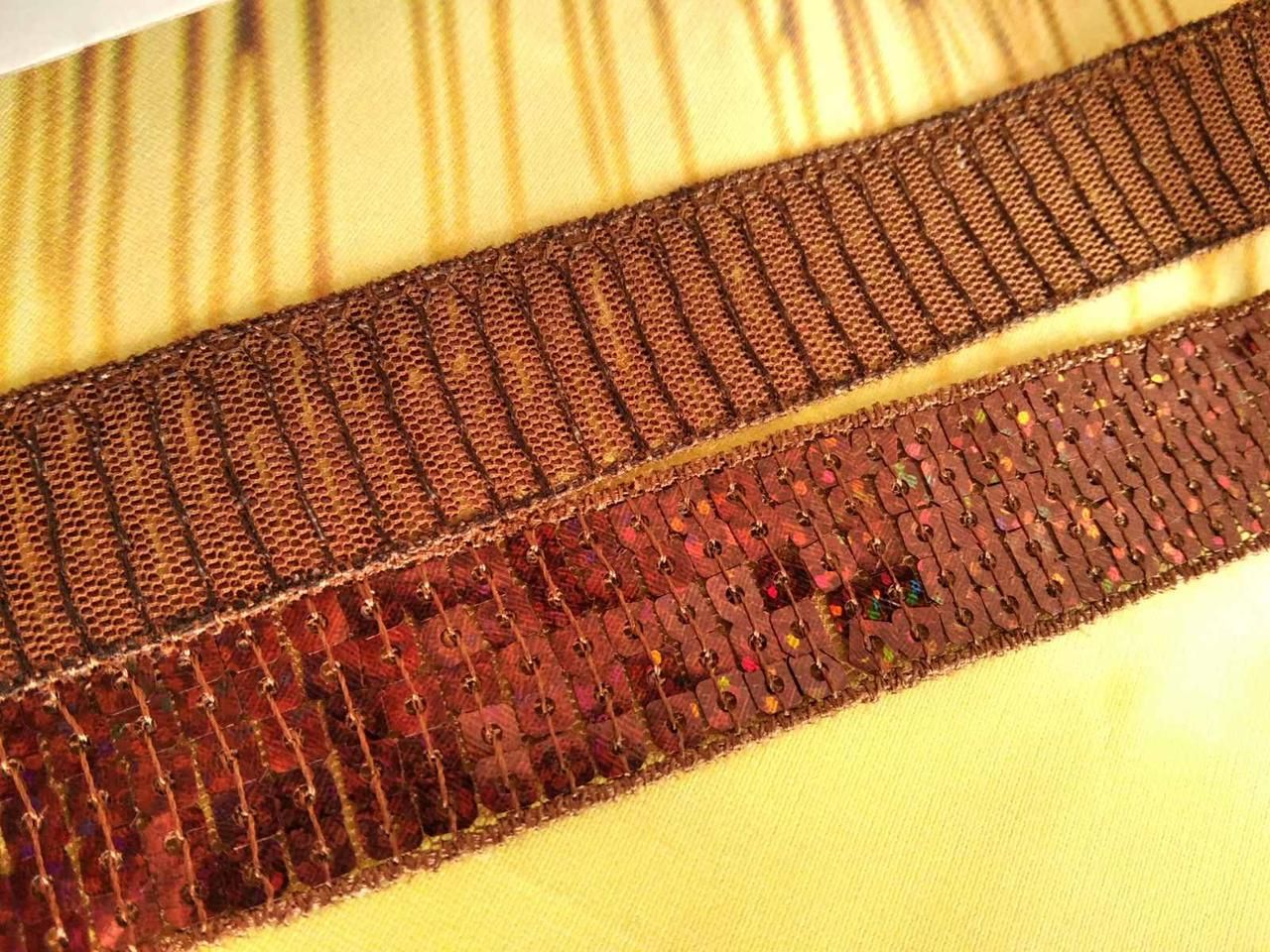 Тесьма коричневая с паетками на сетке, шириной 2 см. Очень красиво и ярко смотрится. Производство Турция.