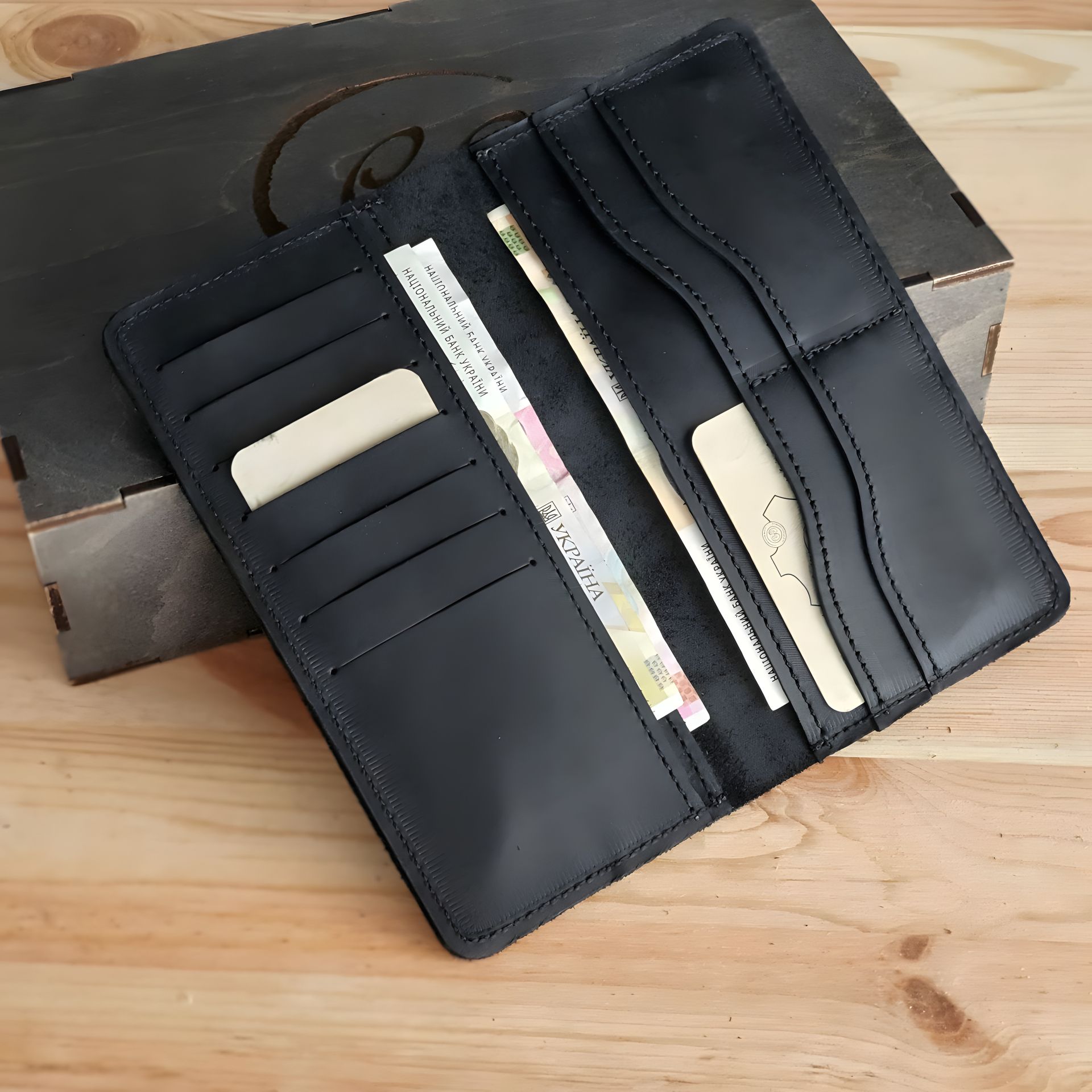 Функциональность и Вместительность: Купюрник имеет 11 карманов для карт и 3 отдела для купюр, что позволяет организовать все ваши финансовые средства и документы в одном месте