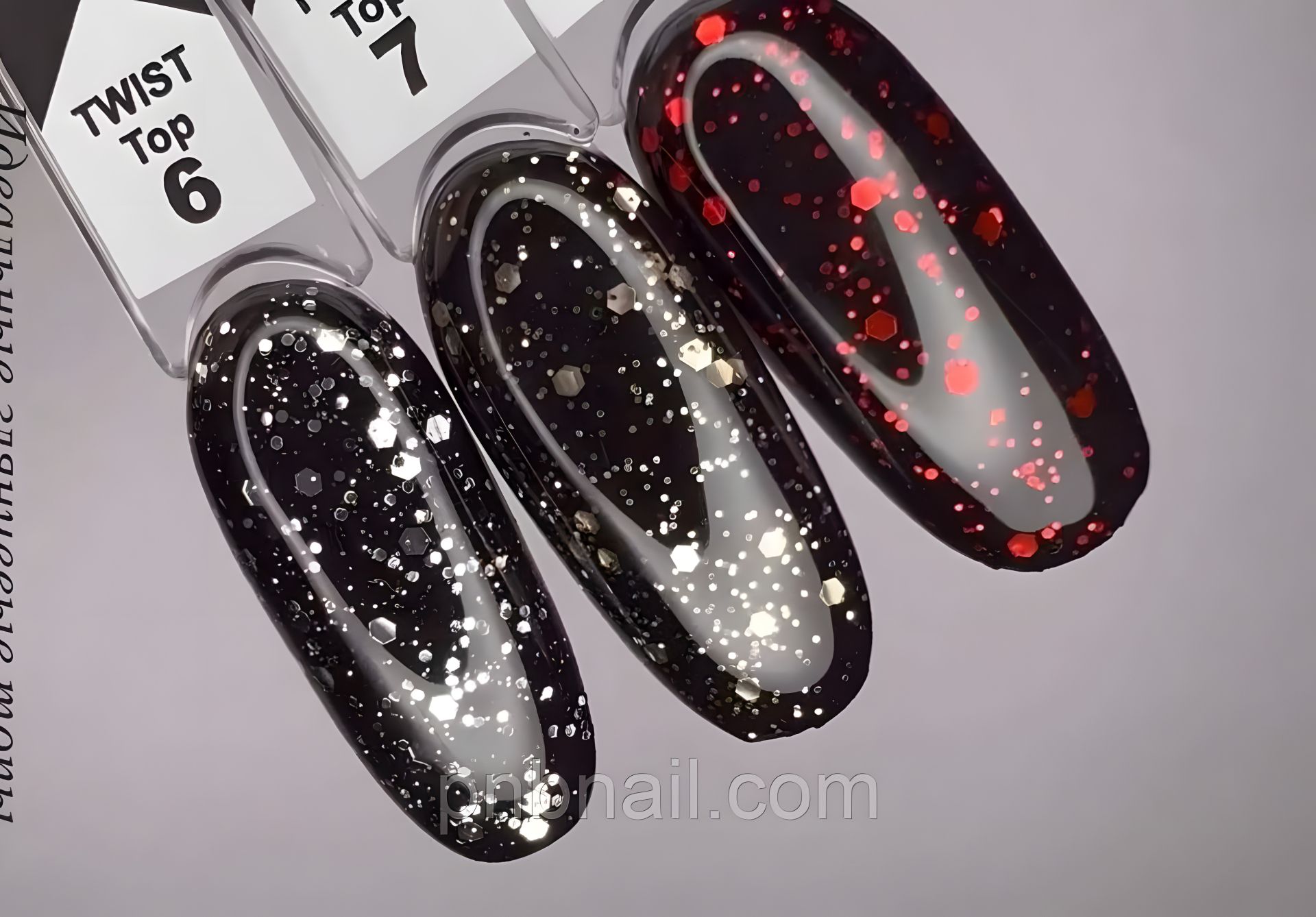 OXXI TWIST TOP 06 - это прозрачное финишное покрытие для гель лака без липкого слоя с серебристыми вкраплениями разных размеров .