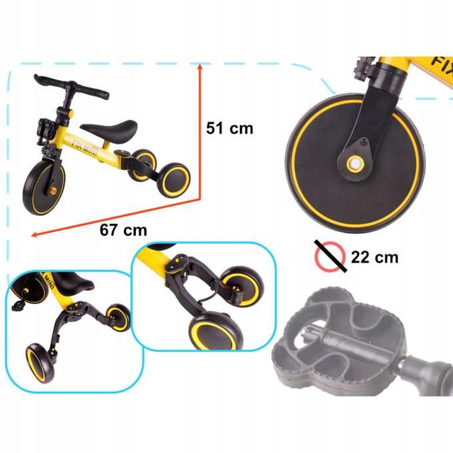 В самом конце вашего малыша ждет самая сложная задача - задние колеса можно сложить так, чтобы они оказались вплотную друг к другу. Это потребует от вашего ребенка сохранять равновесие и даст ему отличный урок перед поездкой на настоящем двухколесном велосипеде!