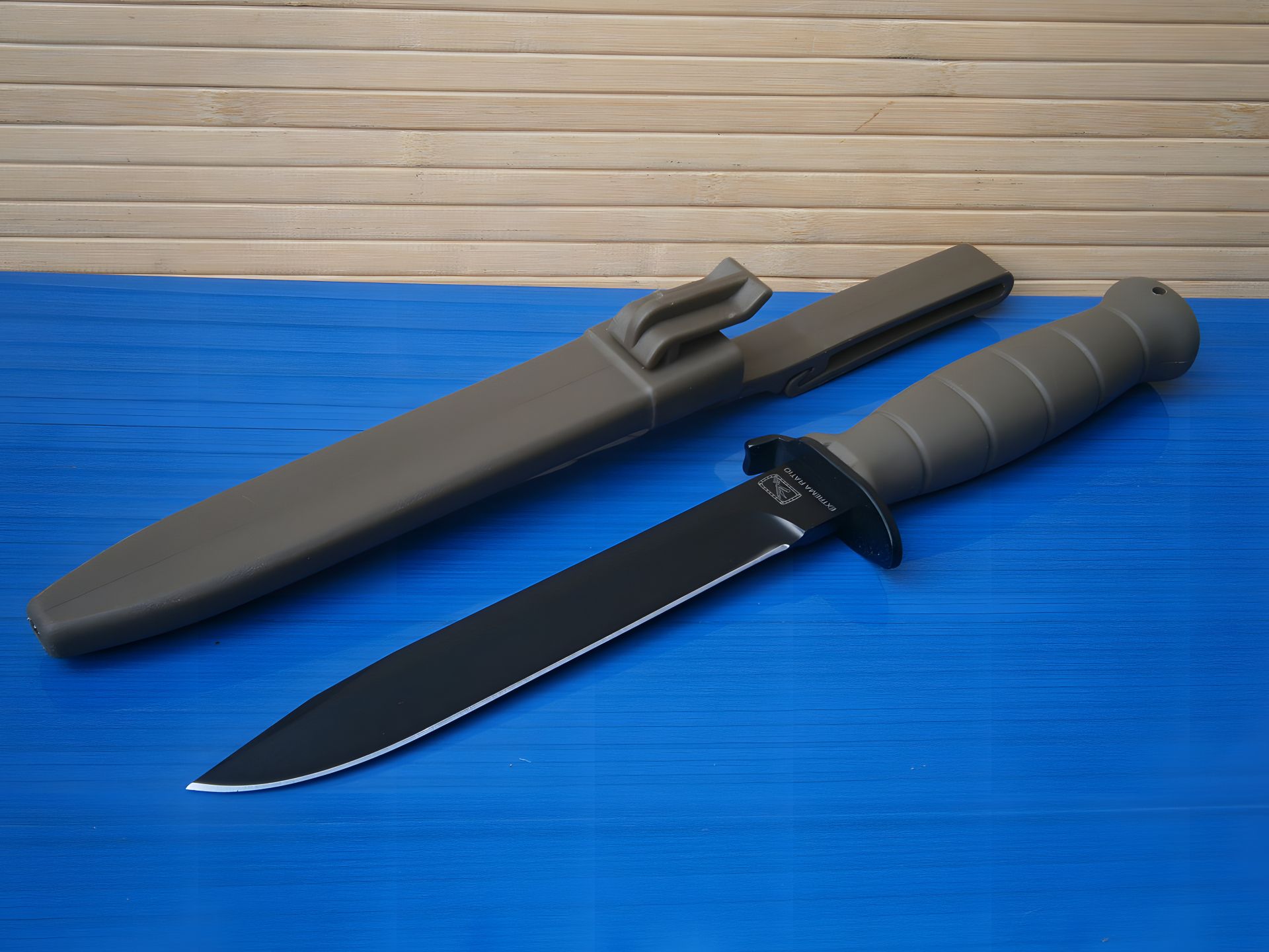 В комплекте полимерные ножны оригинальной конструкции, не имеющие металлических частей. Ножны имеют ременное крепление, позволяющее прикрепить их к ремню шириной до 60 мм или к платформе MOLLE. Особенности: