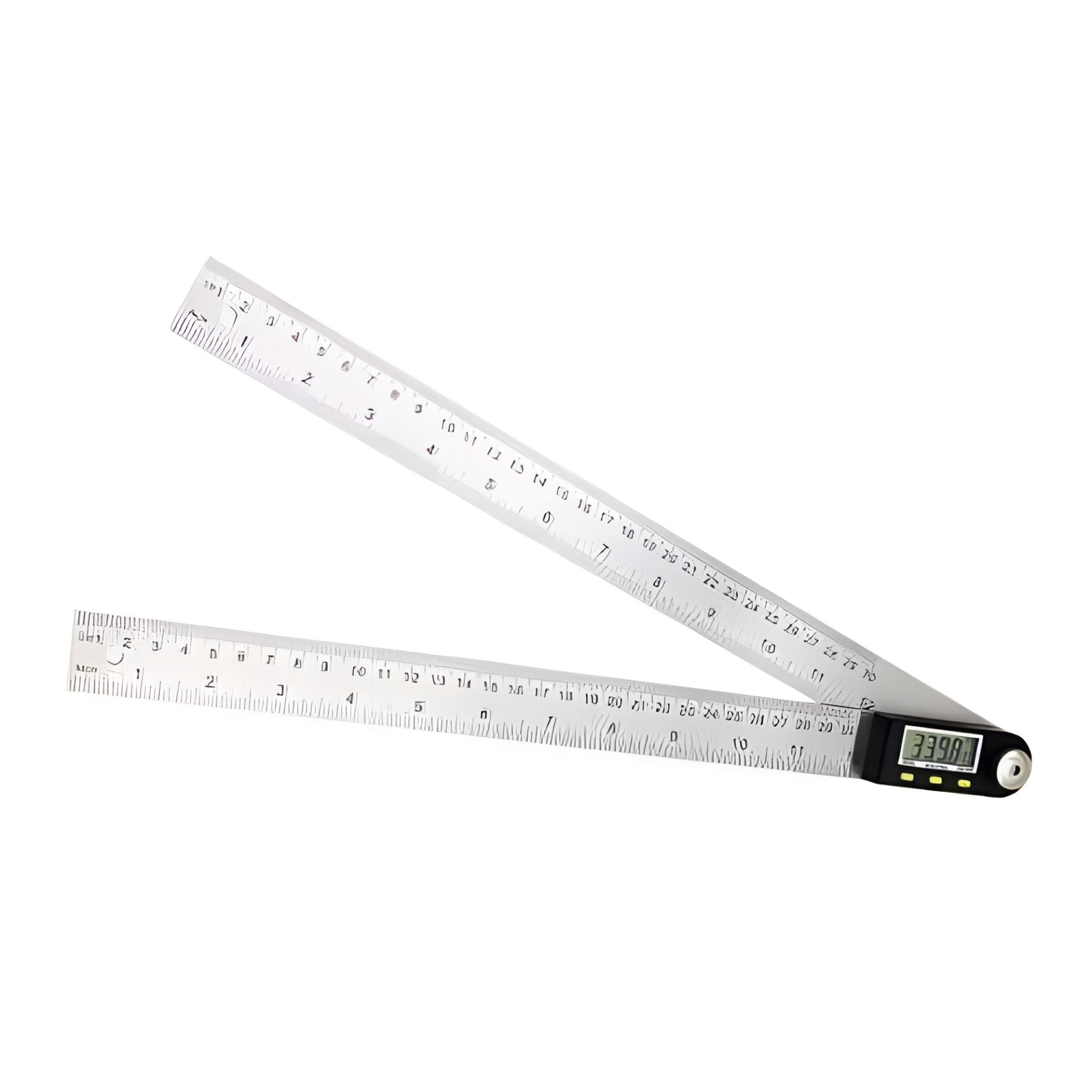 Чтобы подготовить прибор к работе, сведите вместе 2 линейки. Затем на те кнопку On/Off. Далее разводите линейки до тех пор, пока они не образуют нужный угол. Его значение появится на экране. Задержать его можно кнопкой Hold. Она же поможет показать обратное значение угла. Zero обнулит полученные цифры.