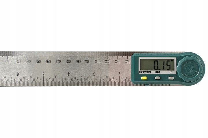 Чтобы подготовить прибор к работе, сведите вместе 2 линейки. Затем на те кнопку On/Off. Далее разводите линейки до тех пор, пока они не образуют нужный угол. Его значение появится на экране. Задержать его можно кнопкой Hold. Она же поможет показать обратное значение угла. Zero обнулит полученные цифры. Также у угломера есть кнопка выбора единиц измерения угла градусы/минуты.