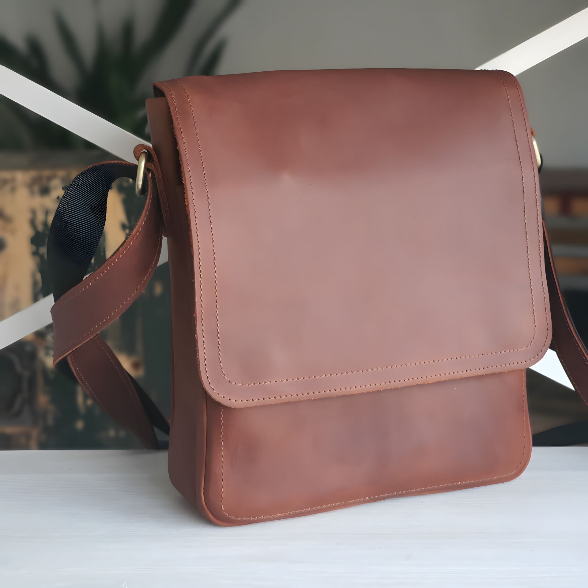 Мужская кожаная сумка с ремнем через плечо. Вместительная и удобная модель с декоративной строчкой. Пошита из натуральной кожи КРС обработанной воском, винтажной Crazy Horse. В сумке одно основное отделение, в котором есть потайной карман на молнии и карман поменьше для телефона, документов или ключей. Основное отделение закрывается металлической молнией. Спереди сумки расположены 2 кармана на молнии, один из них имеет объемную вставку. Вся сумка закрывается клапаном на магнитных кнопках. Ремень через плечо ( 150 см) обшит кожей и регулируется по длине. Размеры сумки 28*24*7 см