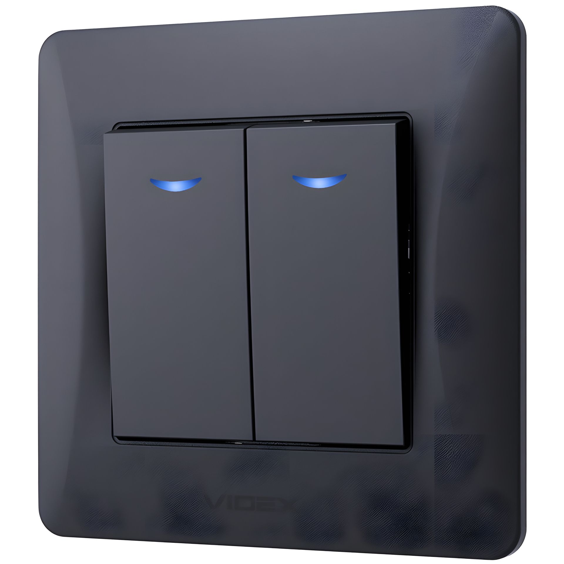 Двухклавишный выключатель повышенной огнеупорности с подсветкой VIDEX BINERA VF-BNSW2L-BG, черный графит