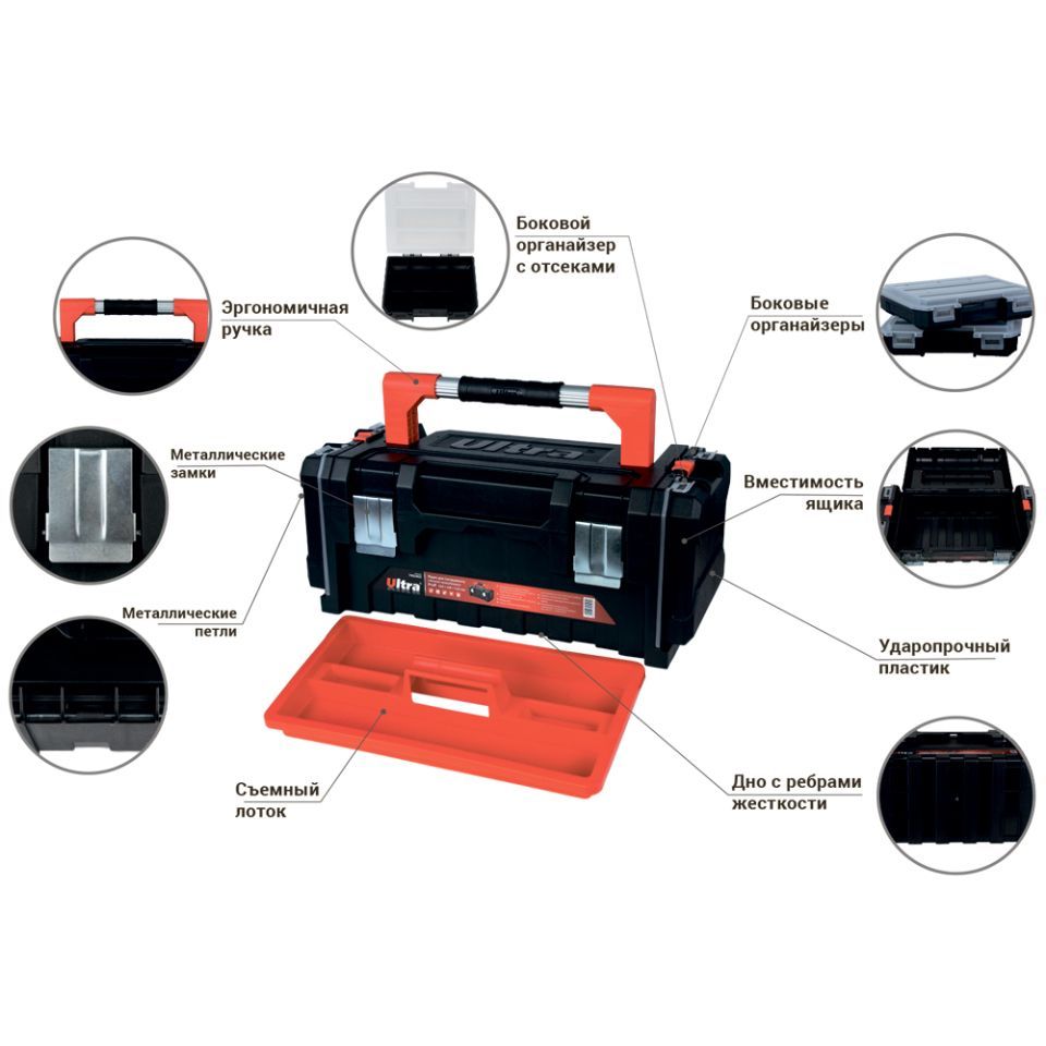 Ящик для инструмента металлические замки боковые органайзеры Profi 510×230×210мм ULTRA (7402402) предназначен для хранения, транспортировки, переноса и удобного доступа к ручному инструменту. Помогает системно организовать хранение мелких деталей: крепежа, шайб, гаек и других мелочей. Простота в поиске необходимых деталей обеспечивается наличием нескольких секций.