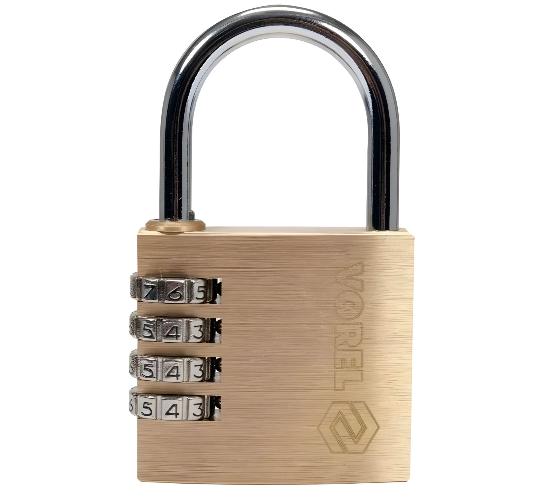 Кодовый навесной замок: латунный корпус 50х13.9х46 мм, стальная дуга 34х32х6 мм. Vorel 77609