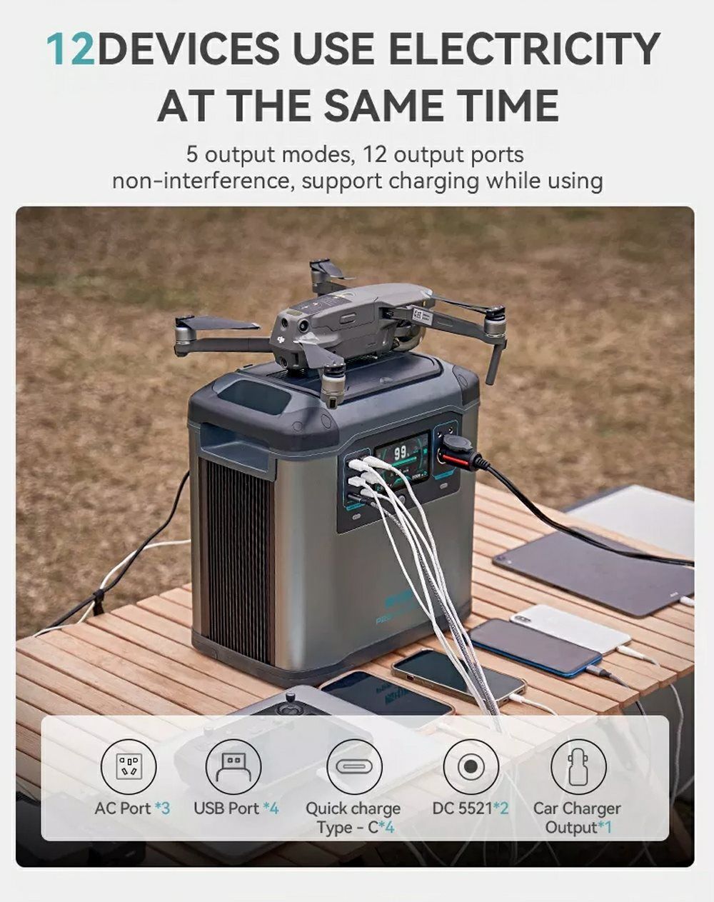С портативной электростанцией FlashFish Р25 возможно заряжать до 11 устройств одновременно, так как она оснащена 11 выходами для зарядки: