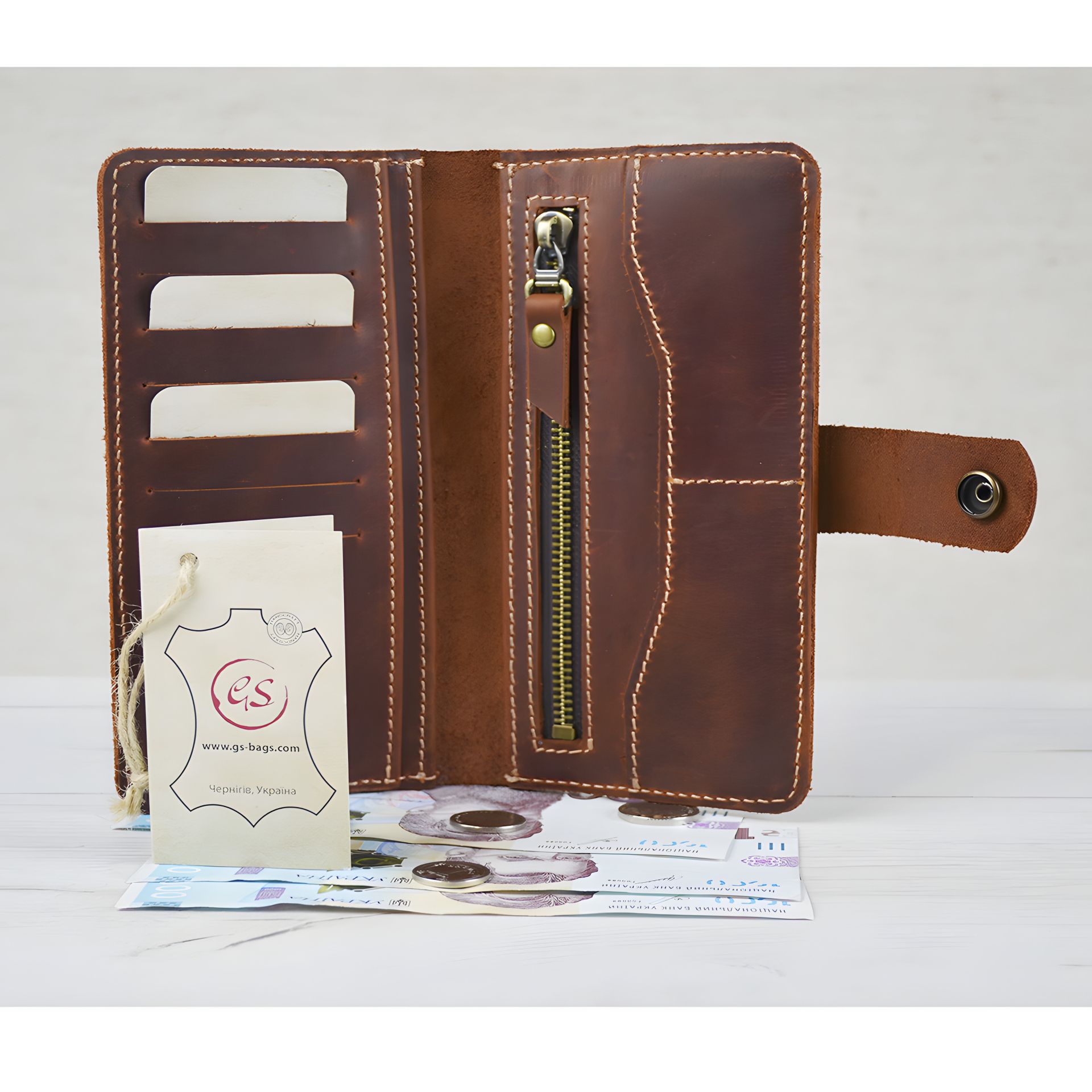 Женский кожаный кошелек с монетницей на молнии GS, коньячный цвет