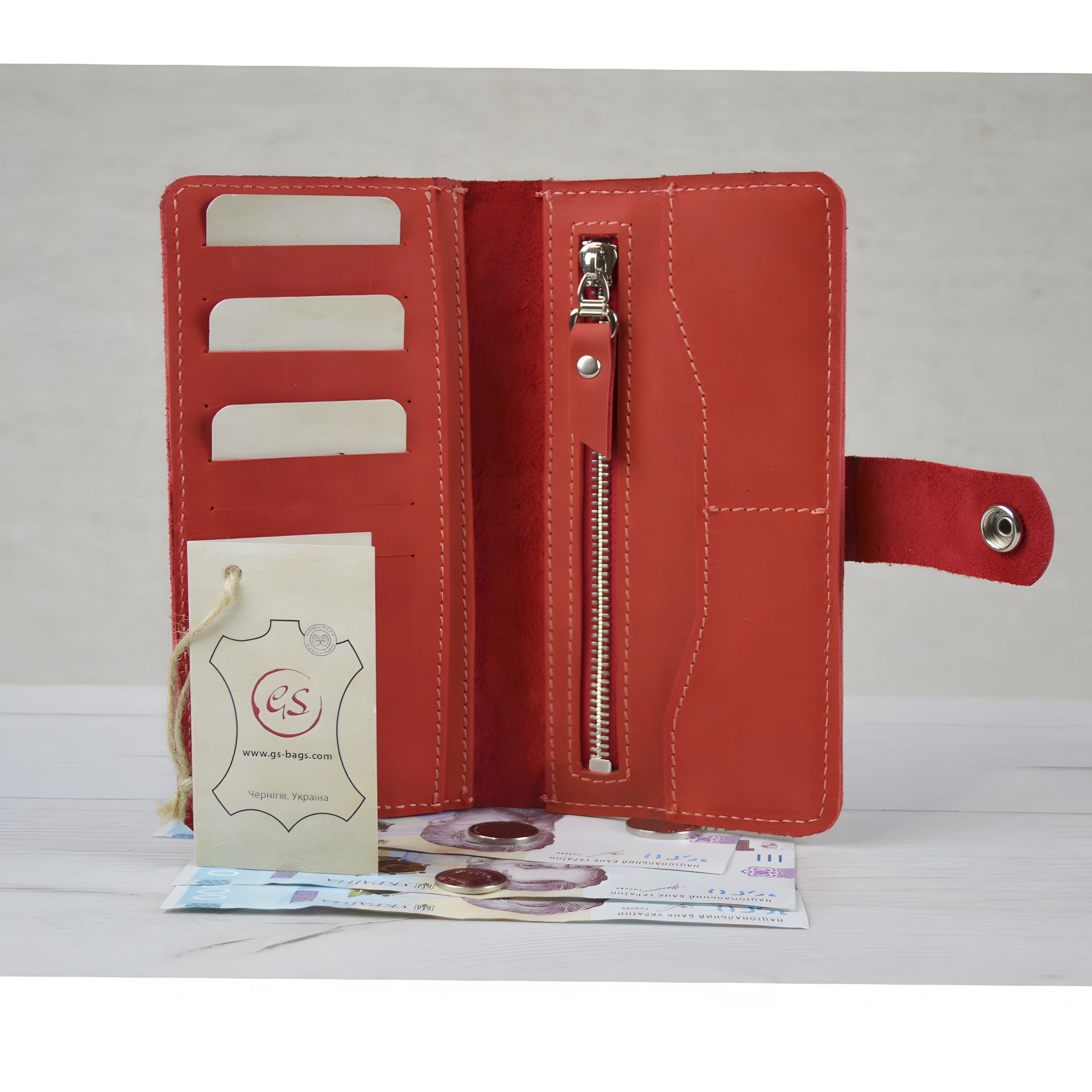 Женский кожаный кошелек , купюрник красного цвета. Кошелек пошит из натуральной кожи КРС , вощеной винтажной Crazy Horse. Внутри 9 карманов для карт , внутренняя монетница на молнии , 3 отдела для купюр.
