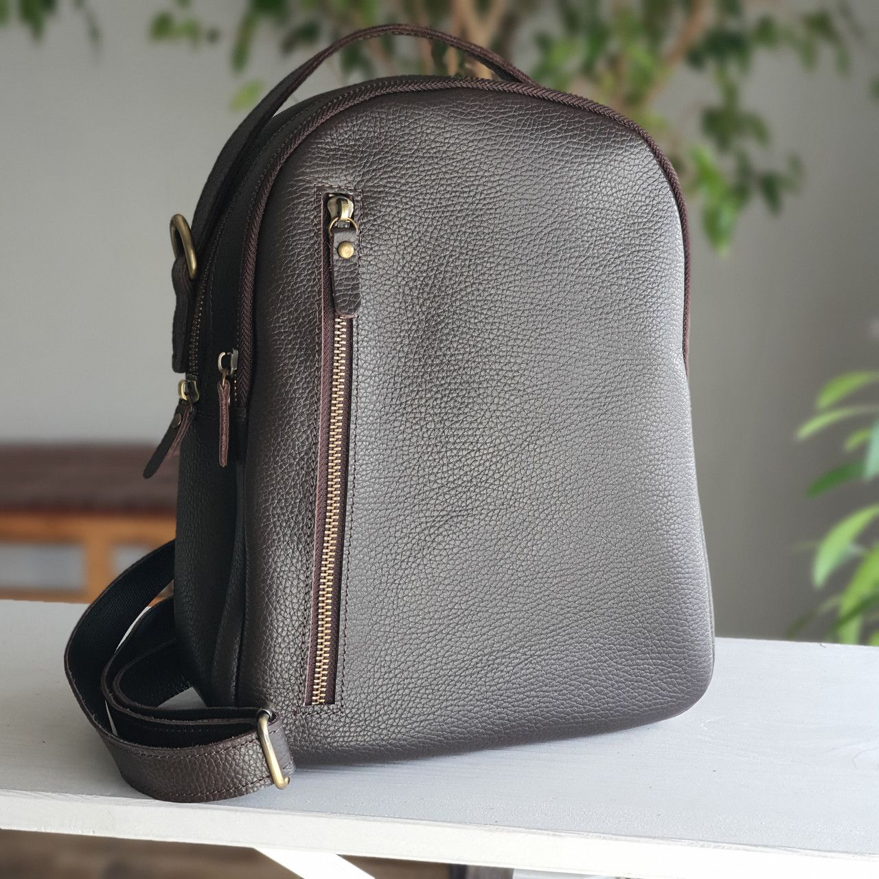 Женский кожаный рюкзак GS коричневого цвета. Пошит из плотной телячьей кожи с фактурным рисунком - флотар. Этот вид кожи имеет влагоотталкивающее устойчивое к царапинам покрытие. Кожа эластичная , мягкая и приятная на ощупь. В рюкзаке 2 отдела. Ширина основного отдела 9 см Внутри - потайной карман на молнии и карман по меньше. Второй отдел шириной 2см. Спереди большой карман на молнии. В рюкзаке есть ручка для переноски и 2 шлейки.