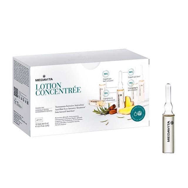Лосьйон Medavita Lotion Concentrée Anti-Hair Loss Treatment – засіб для ефективної боротьби з випадінням волосся. Продукт покращує мікроциркуляцію шкіри голови, зміцнює волосяні фолікули та активує ріст нового волосся. Активна формула лосьйону містить ретельно підібрані інгредієнти рослинного походження, що мають потужні вазоактивні та антиоксидантні властивості.