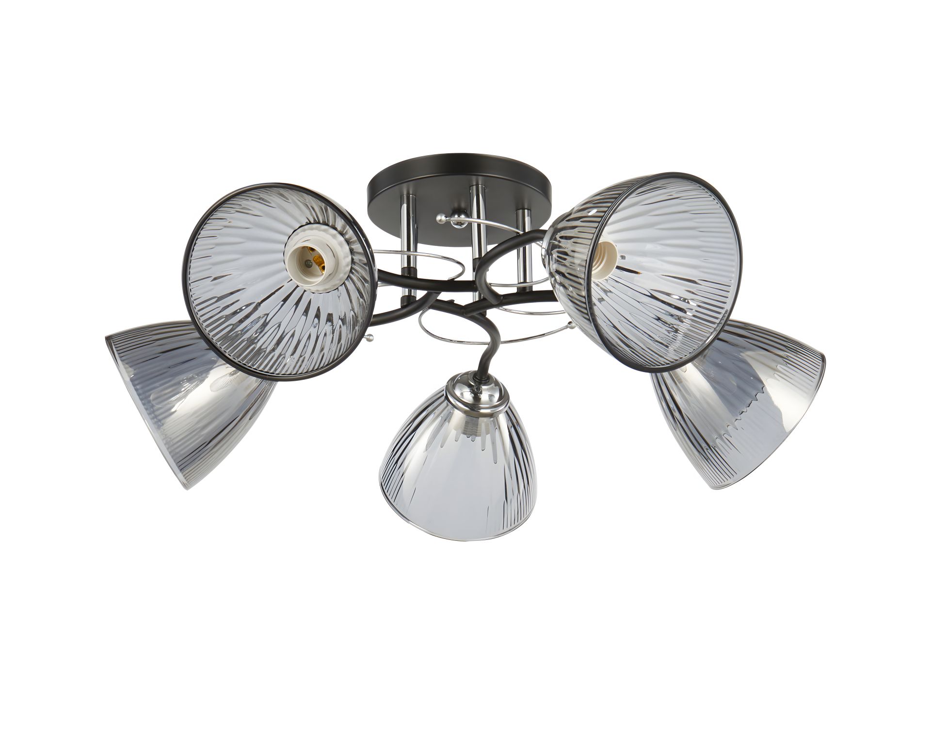 Світильник має металеву основу та п'ть скляних плафонів, які м’яко розсіюють світло, не створюючи різких тіней. Оснащена стандартними патронами E27, що дозволяє використовувати звичайні або LED-лампи.