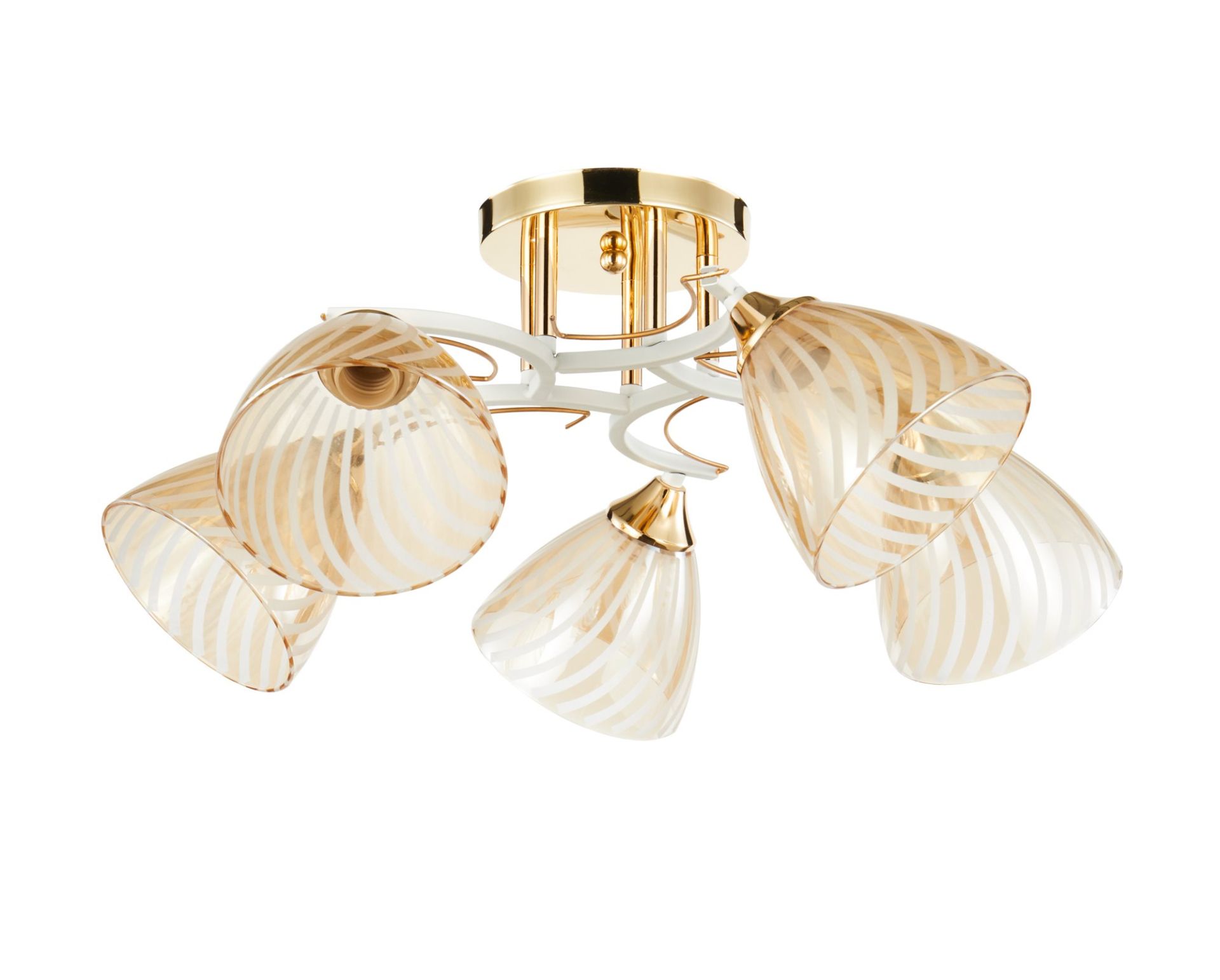 Зробіть ваш простір по-справжньому вишуканим з люстрою на 5 плафонів 6120-5. Цей світильник — втілення елегантності, що поєднує розкішне золоте оздоблення з чистим білим склом, створюючи атмосферу витонченості та тепла.