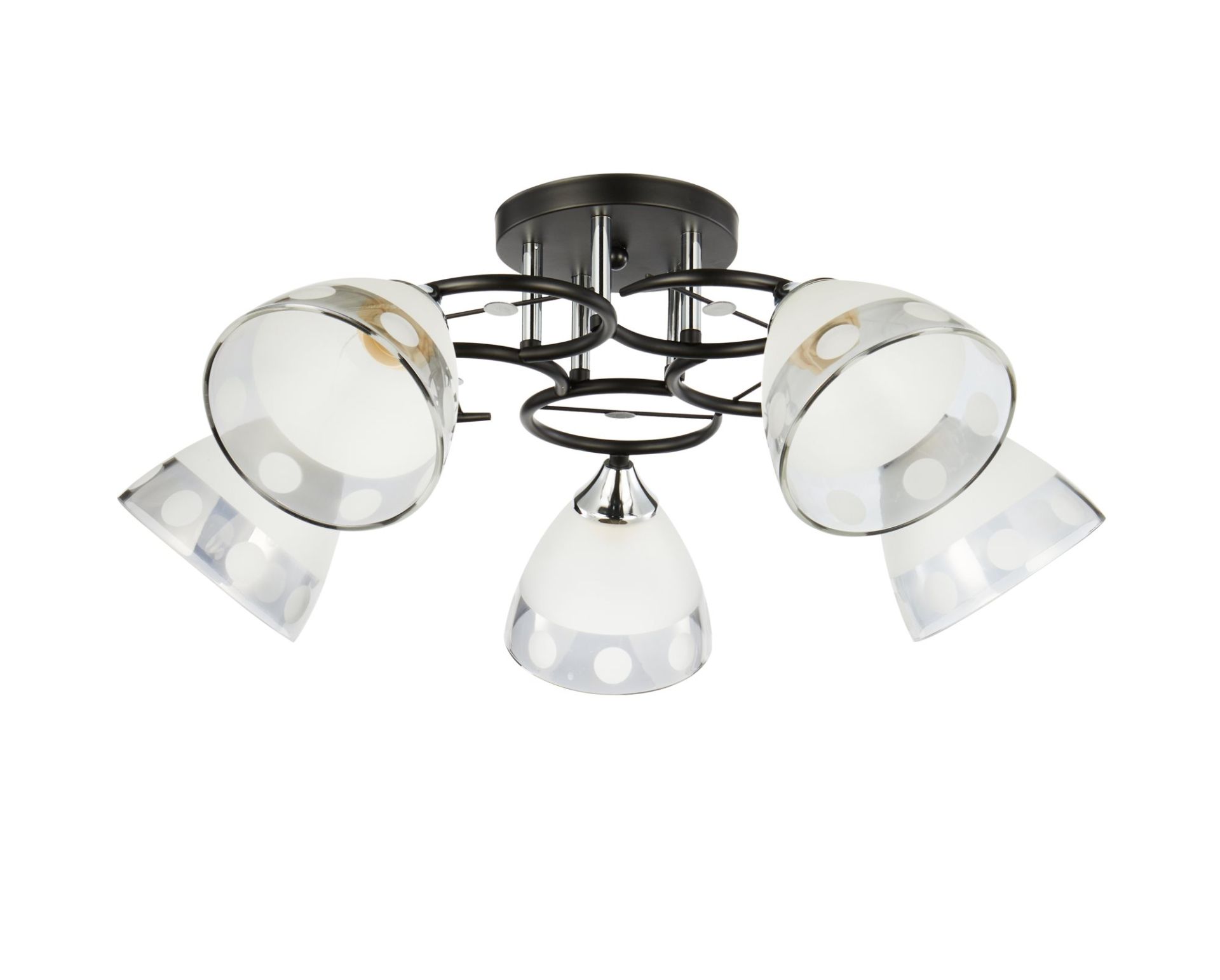 Металева основа чорного кольору поєднується з глянцевими хромованими вставками, які додають легкого блиску. Скляні плафони рівномірно розсіюють світло, роблячи освітлення комфортним. Люстра обладнана стандартними патронами E27, що дає змогу використовувати лампи різного типу — LED, енергозберігаючі чи звичайні.