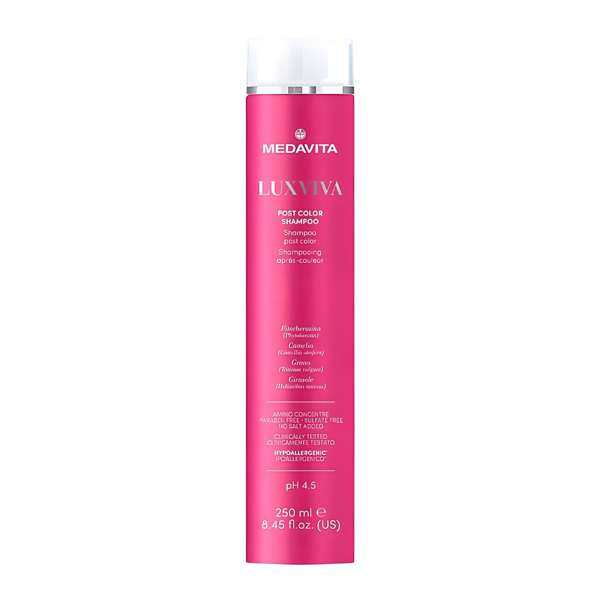 Шампунь Medavita Luxviva Post Color Shampoo дбайливо очищує фарбоване, знебарвлене та меліроване волосся. Містить комплекс натуральних активних інгредієнтів рослинного походження на основі фітокератину, амінокислоти та вітамін B5. Продукт живить, зволожує, надає яскравість, продовжує інтенсивність і життя кольору, робить волосся більш м'яким і блискучим, відновлюючи і зміцнюючи його. Шампунь також містить сонцезахисний фільтр UVA/UVB.