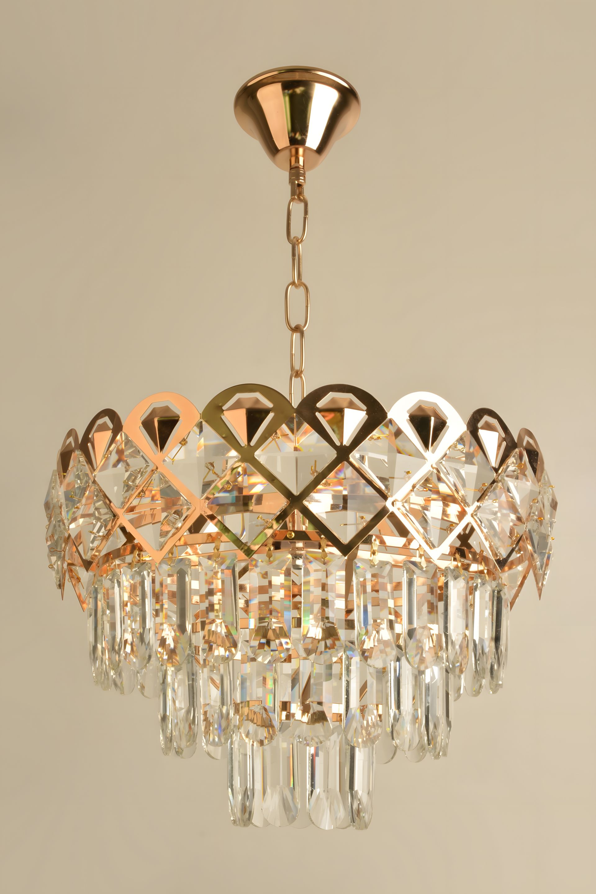 - Металевий каркас у золотистому кольорі та кришталеві підвіски створюють ефектний блиск, який підкреслить статус вашої оселі.