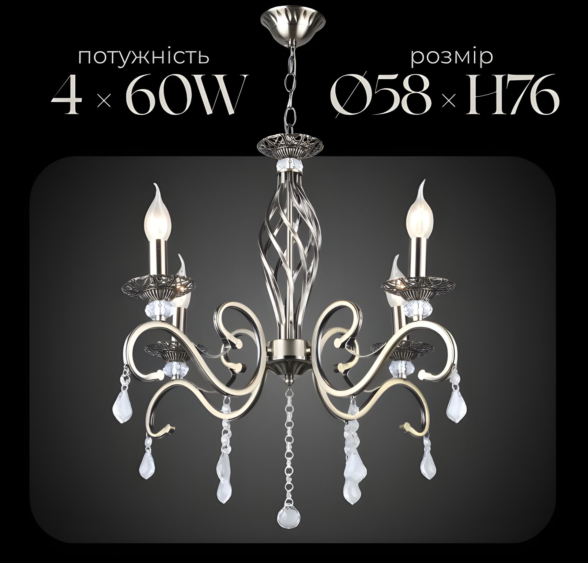 B N1208/4 — витончена класична люстра з бронзовим каркасом і декоративними елементами. Особливість дизайну — лампи вкручуються у тримачі, що стилізовані під свічки, створюючи ефект класичного підсвічника. Така люстра додає інтер’єру тепла, затишку та елегантності. Чудовий вибір для віталень, залів, спалень та просторих кімнат.