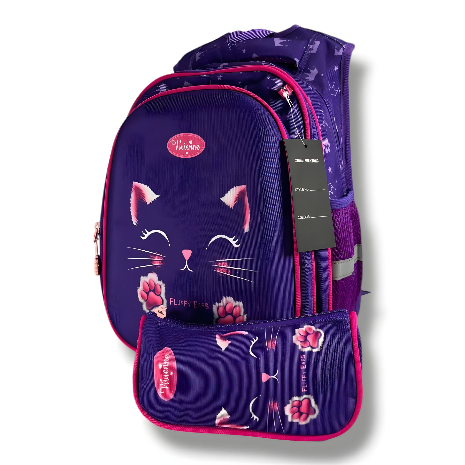 Дівчачий шкільний рюкзак для 6–9 років з малюнком Котик та пеналом, фіолетовий