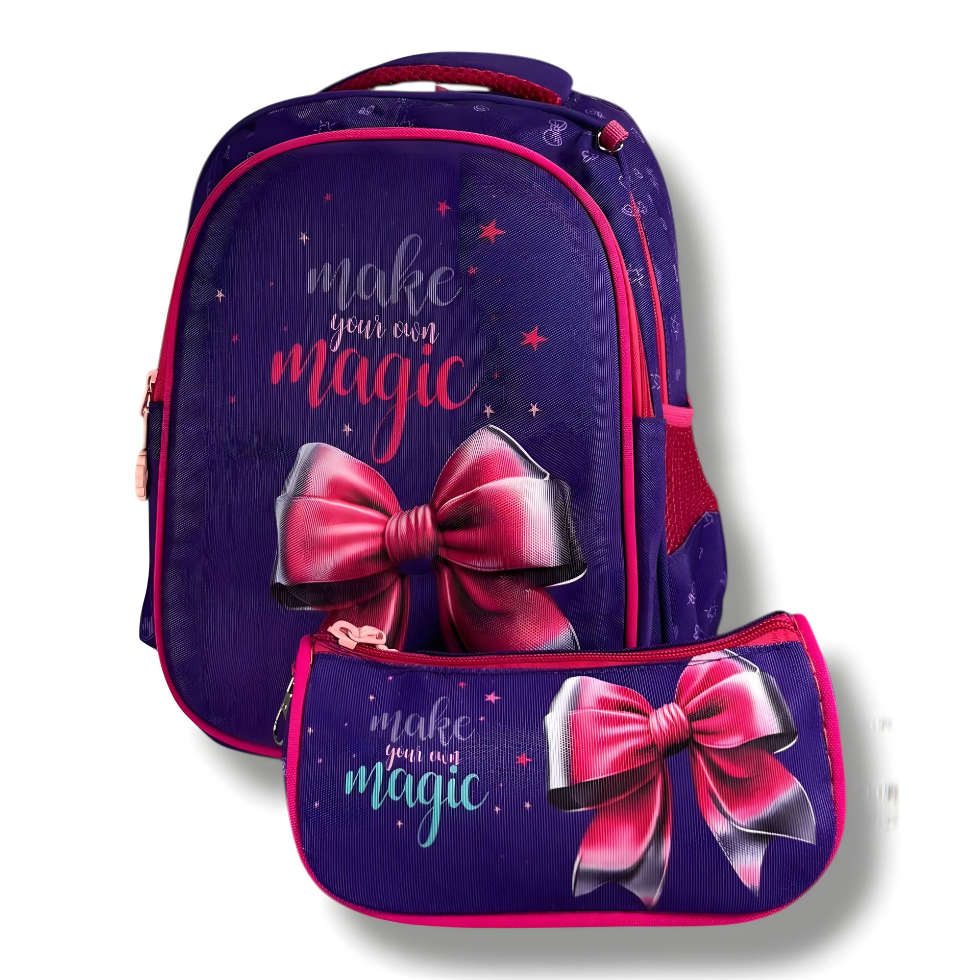 Фіолетовий колір у поєднанні з милим принтом бантика — це ідеальний варіант для дівчинки, яка хоче виглятакти стильно. А ще — приємний бонус: пенал у потакрунок у комплекті!