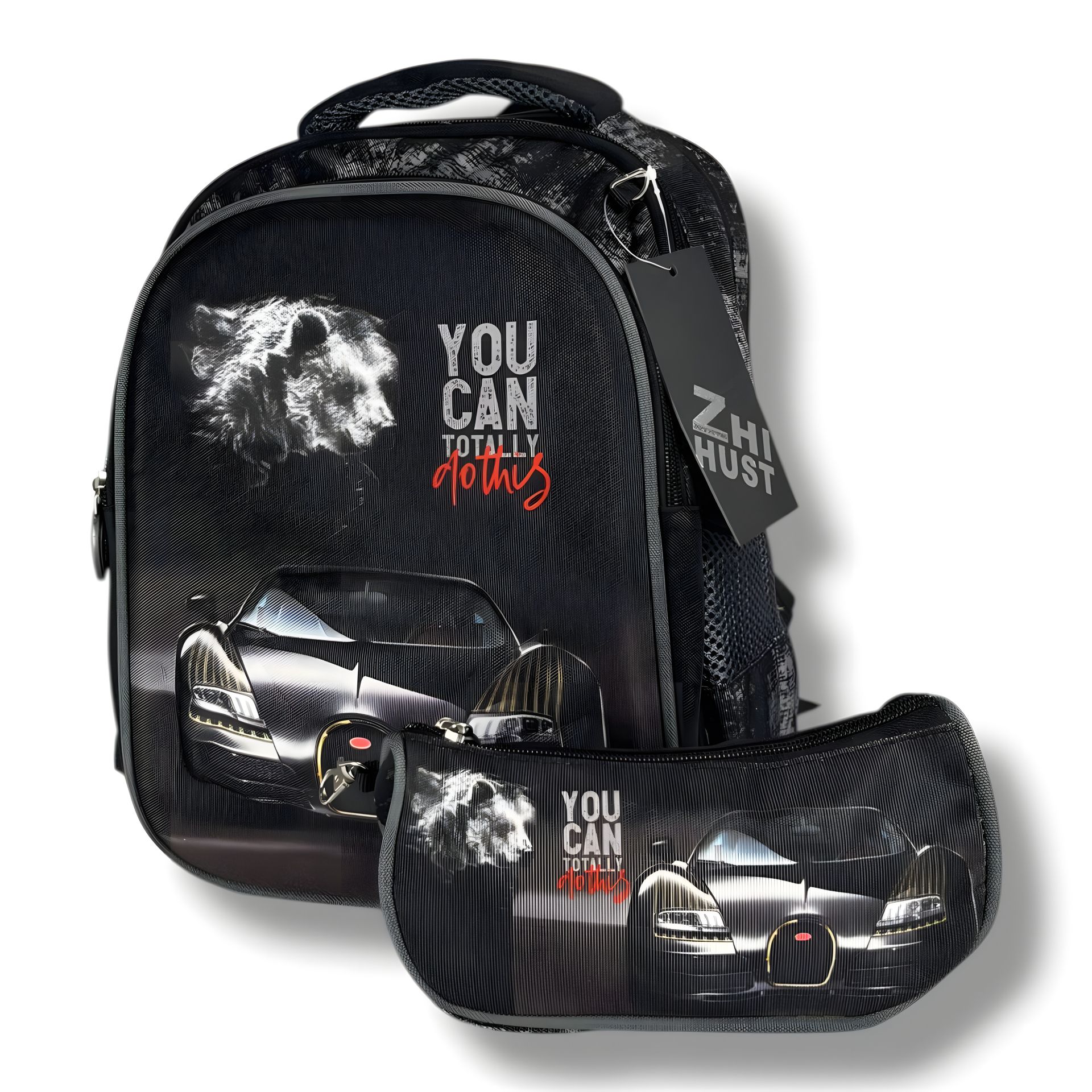 Цей чорний рюкзак з яскравим зображенням автомобіля та написом “You can totally do this” створений спеціально для хлопчиків 1–4 класів. Ідеальний для росту до 115 см завдяки компактним розмірам 36×28×18 см та каркасній формі, яка не деформується.