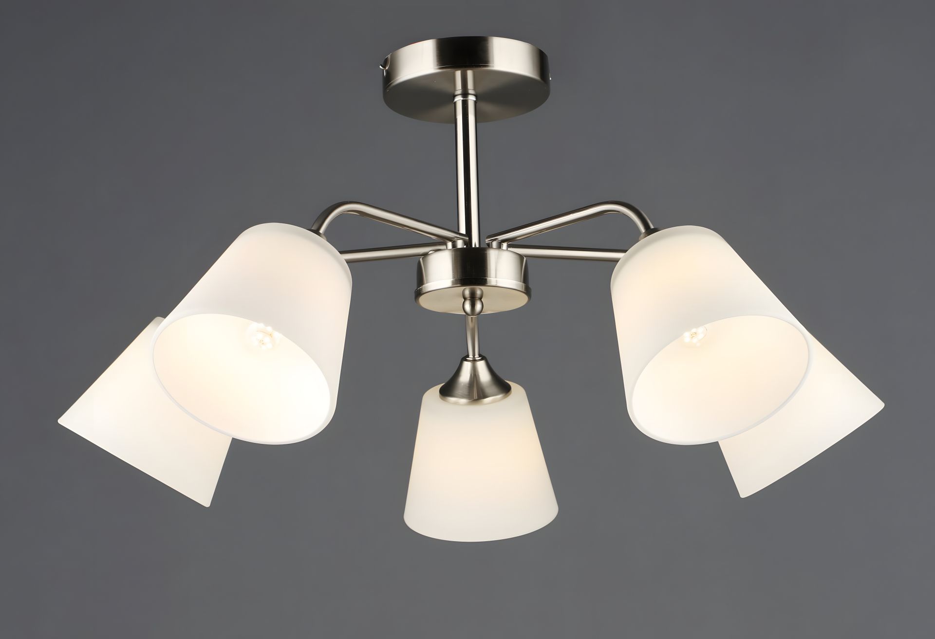 B N6599/5 SN — елегантний стельовий світильник у кольорі нікель із п’ятьма скляними плафонами. Гармонійне поєднання простоти та сучасного стилю для комфортного освітлення в будь-якому інтер’єрі. Джерело світла в комплект не входить.