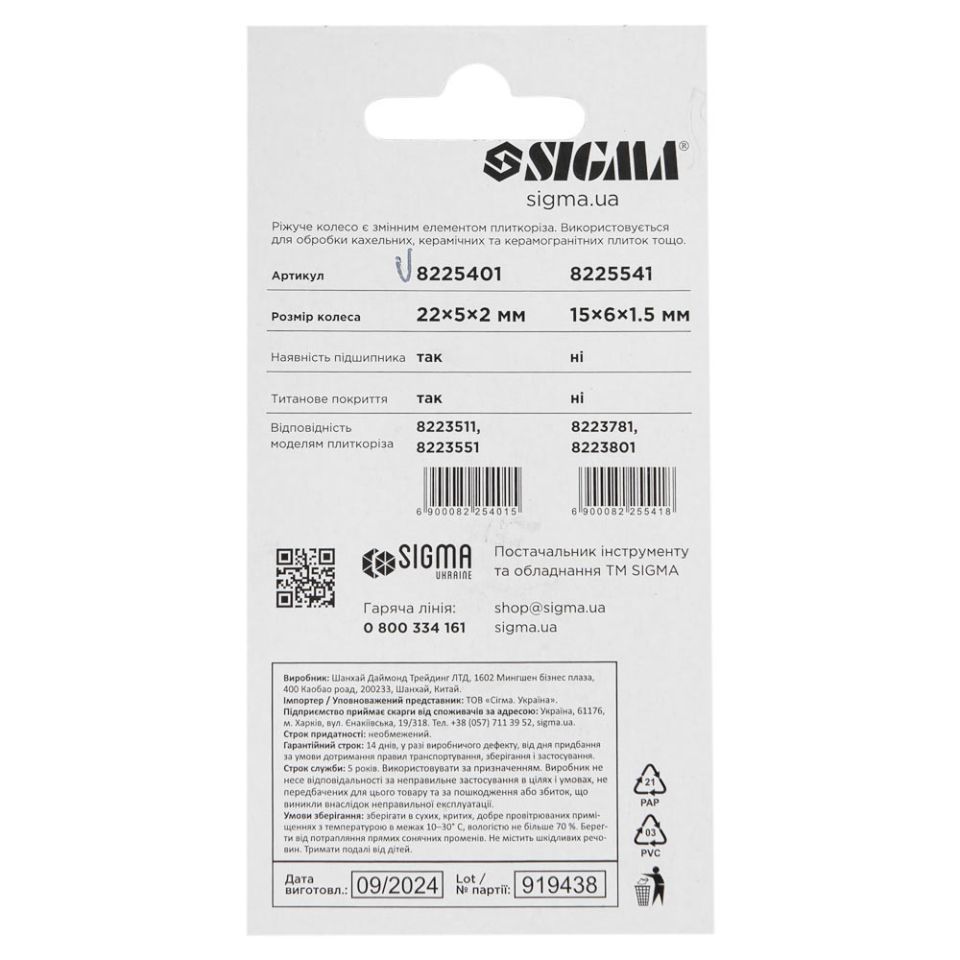 Колесо різальне для плиткорізу 22×5×2мм з підшипником титанове покриття SIGMA 8225401